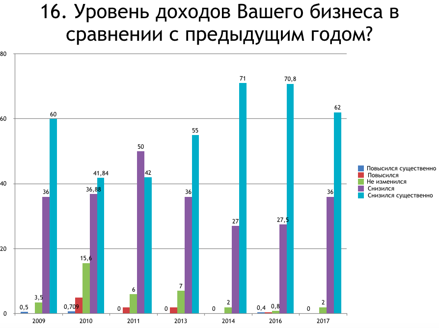 — Если предыдущие проблемы были связаны с налогами, арендой, конфискациями и штрафами, то сейчас тотальная проблема — низкий уровень потребительского спроса и проблемы с нормативно-правовым регулированием. Законы, которые сейчас есть, не только не способствуют, но и препятствуют развитию предпринимательства. Это свидетельствует о системном кризисе. И в нем, судя по опросу, на государство предприниматели не рассчитывают.