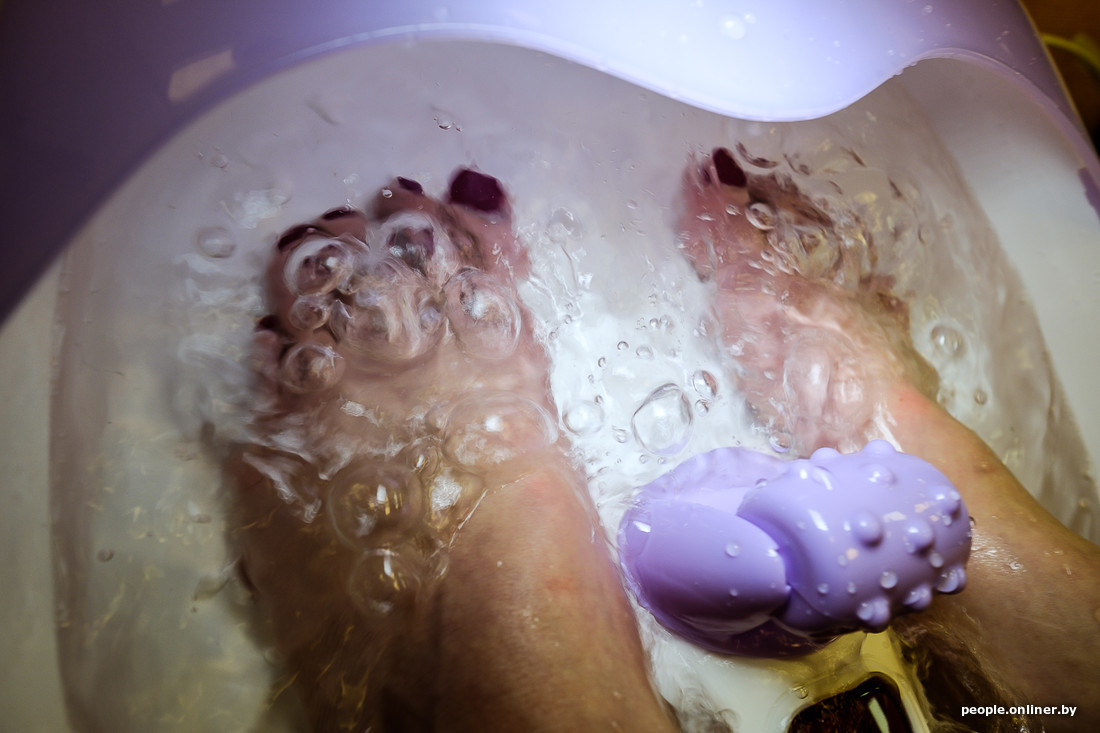 Между тем для оптимального массажа нужна температура около 37—38 градусов. Разбавляем холодной водой, и только после этого Аня с опаской снова погружает ноги в ванночку.