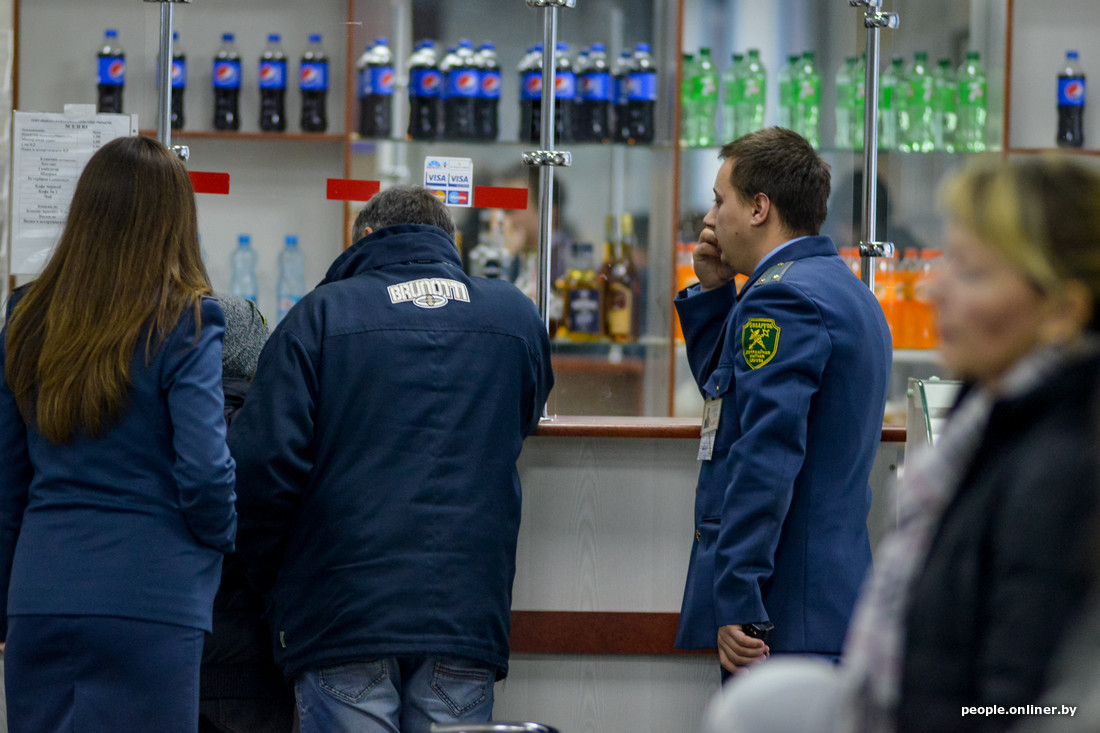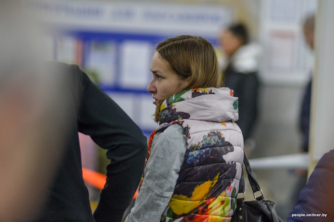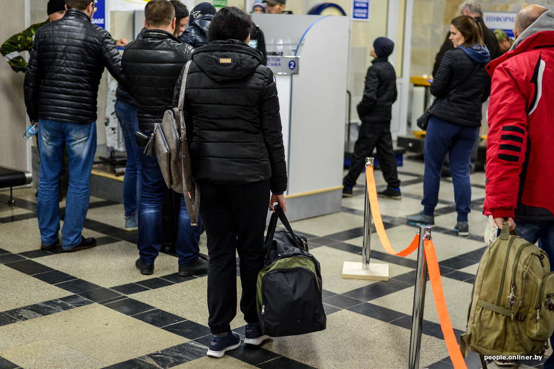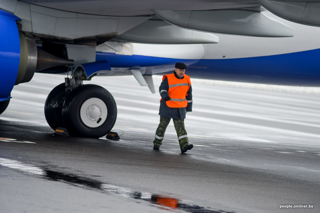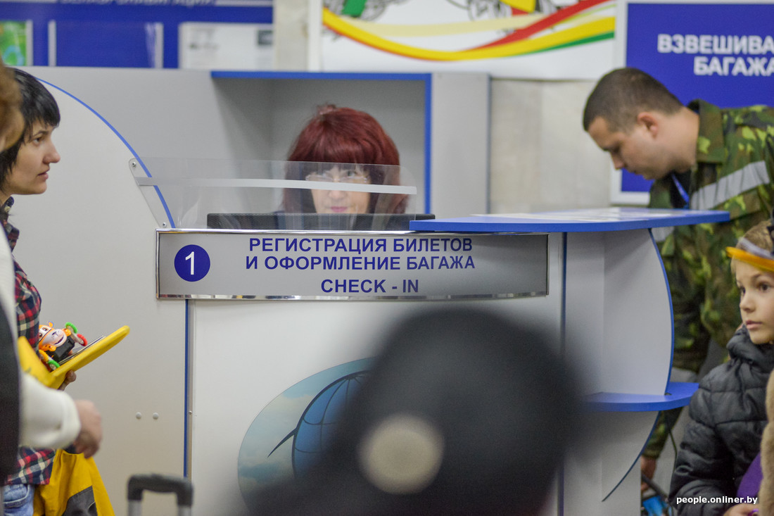 Пассажиры проходят регистрацию. Их потоки распределяют бьющие по глазам ультрамариновые ленты. Самолет на 189 человек путешествует сложным маршрутом: летит из Минска в Хургаду, оттуда в Могилев, потом обратно, где, наконец, берет курс на столицу.