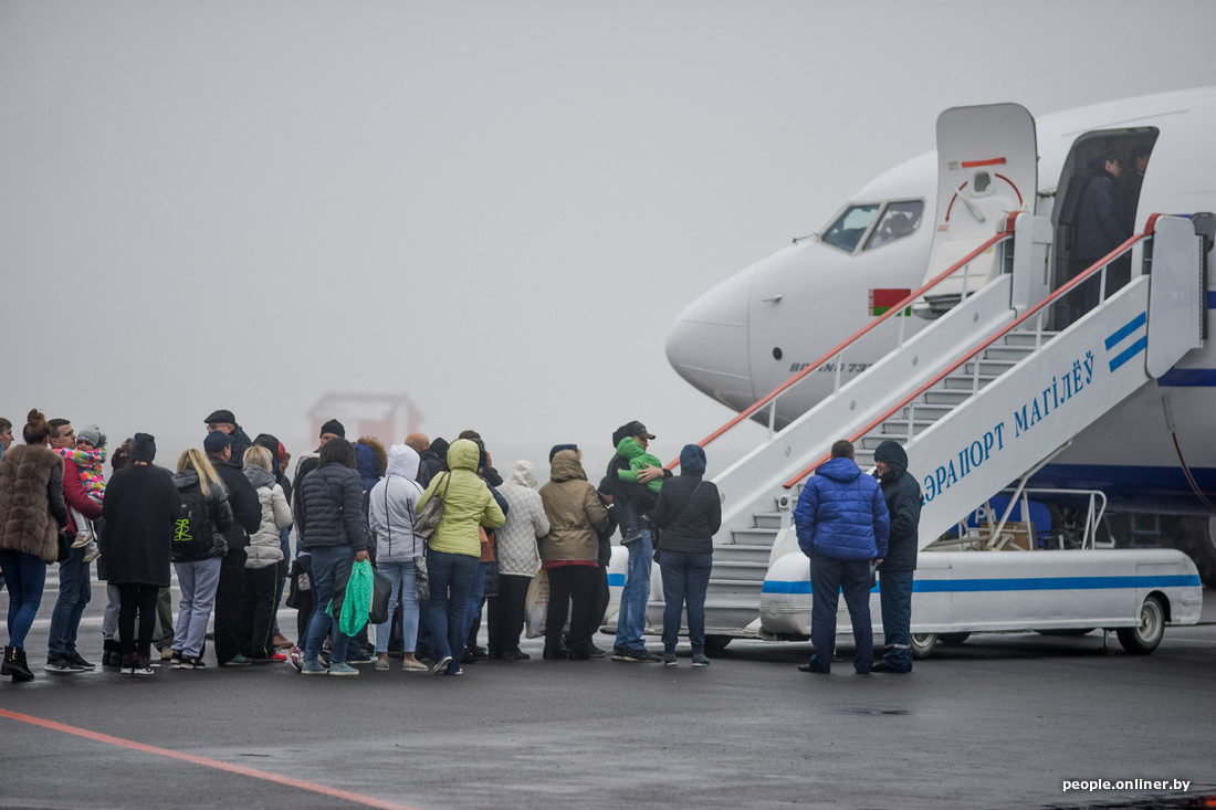 Подается трап для двух сотен могилевских туристов. На изготовке машина с бортовым питанием. Довольные отдыхающие спускаются на родной белорусский асфальт. Их сменщики начинают увлеченно фотографировать.