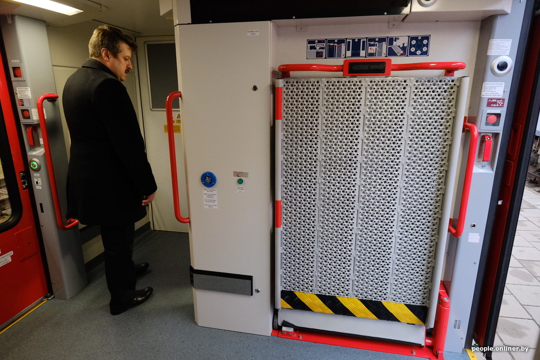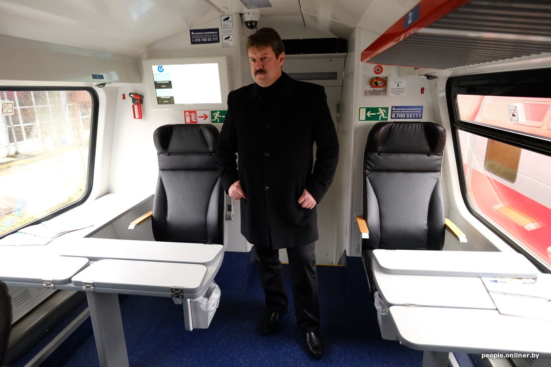 — Отличить поезда белорусского направления от тех, которые используются на местном сообщении, очень просто. У них лобовая часть полностью красная. Что касается салона, то здесь есть дополнительное купе для кондуктора. Еще мы смонтировали рекламные мониторы. На них показывается время, карта, реклама. Можно вывести картинку с камеры, которая расположена в голове поезда.