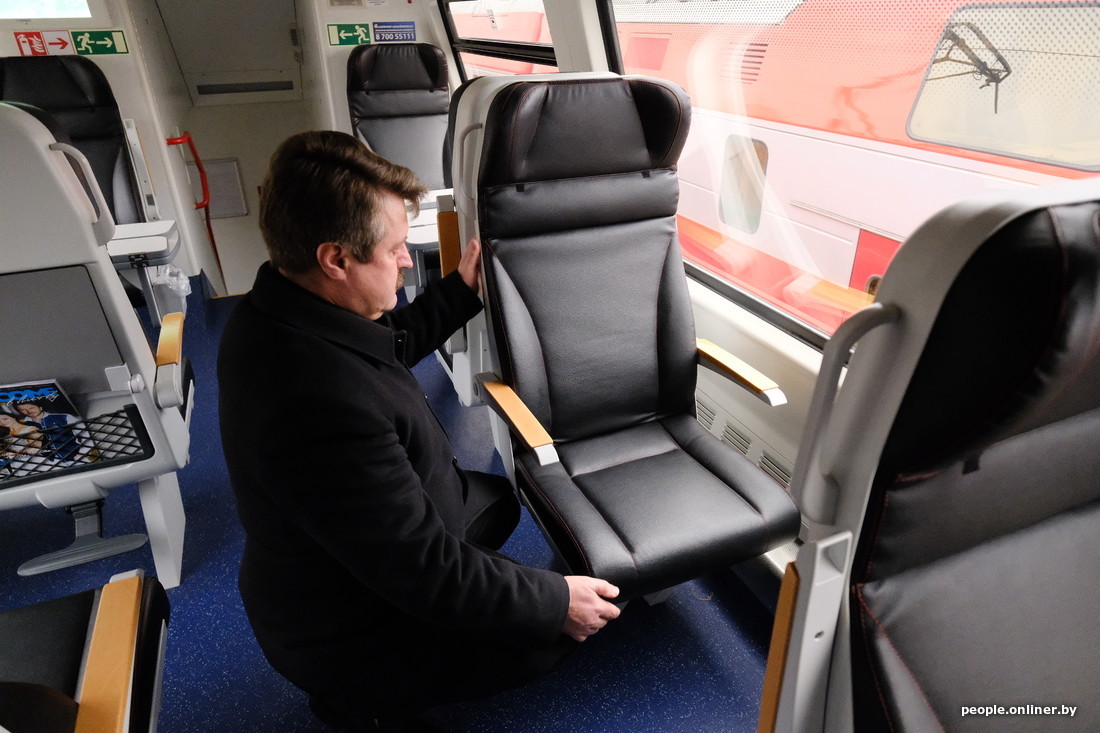 Skoda способна развивать скорость до 160 км/ч. Но, в принципе, делать это негде. На минской дистанции есть несколько участков, на которых можно дать 140. Но в общем скорость составляет 120. Стартуем. Проверяются билеты. Пассажиры начинают играть в медведей и уходят в спячку, скатываясь по высоким сиденьям.