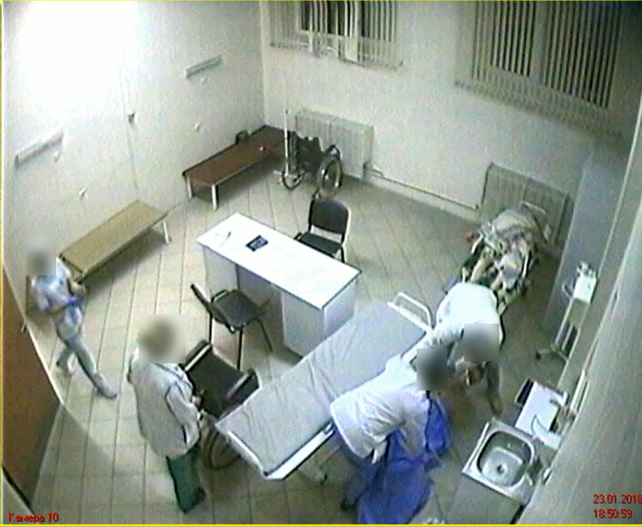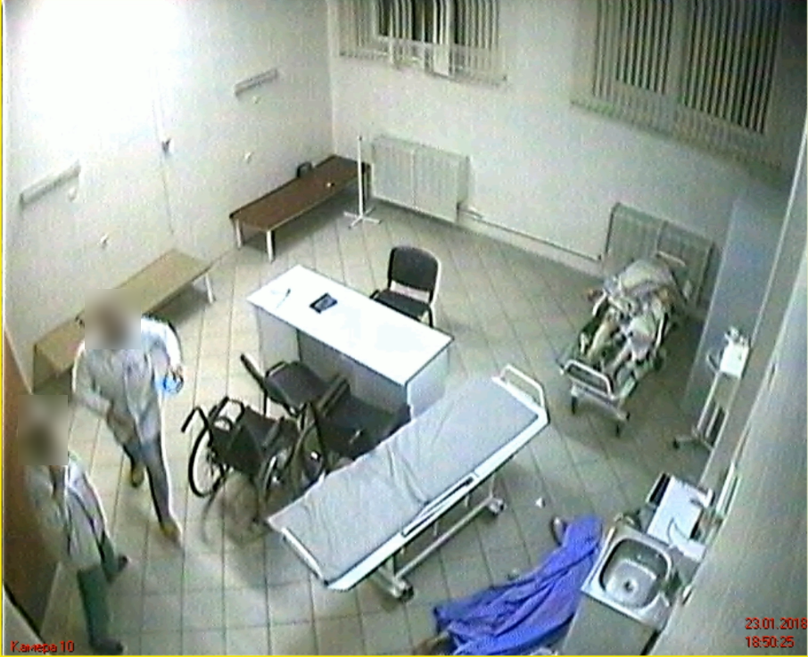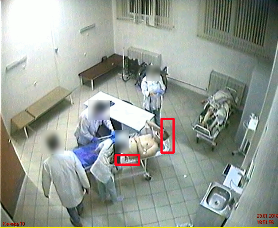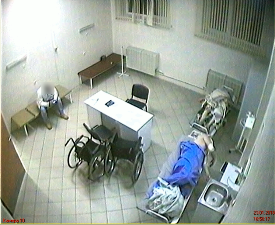 Откуда? Запись с камер наблюдения в БСМП показывает, что в 18:50, через 10 минут после появления в кадре, человек в белом халате сидит на лежанке, а Виктор, едва приходя в сознание, делает попытку и переворачивается, после чего падает с каталки, на которой опущены бортики.