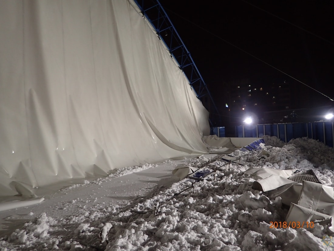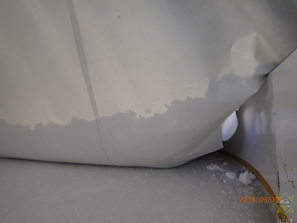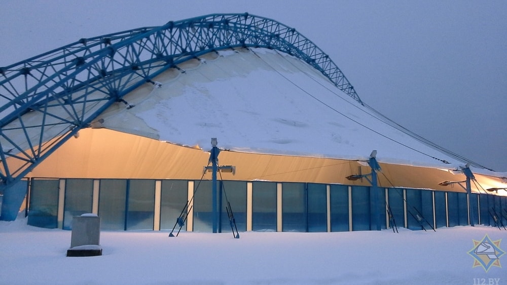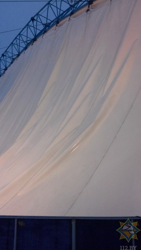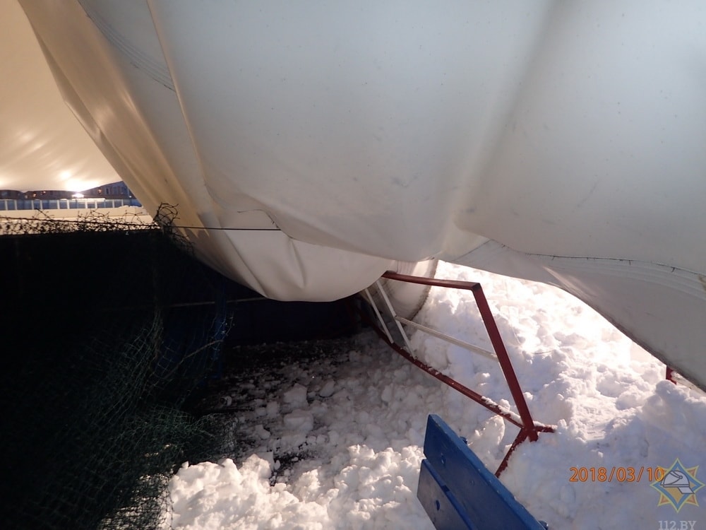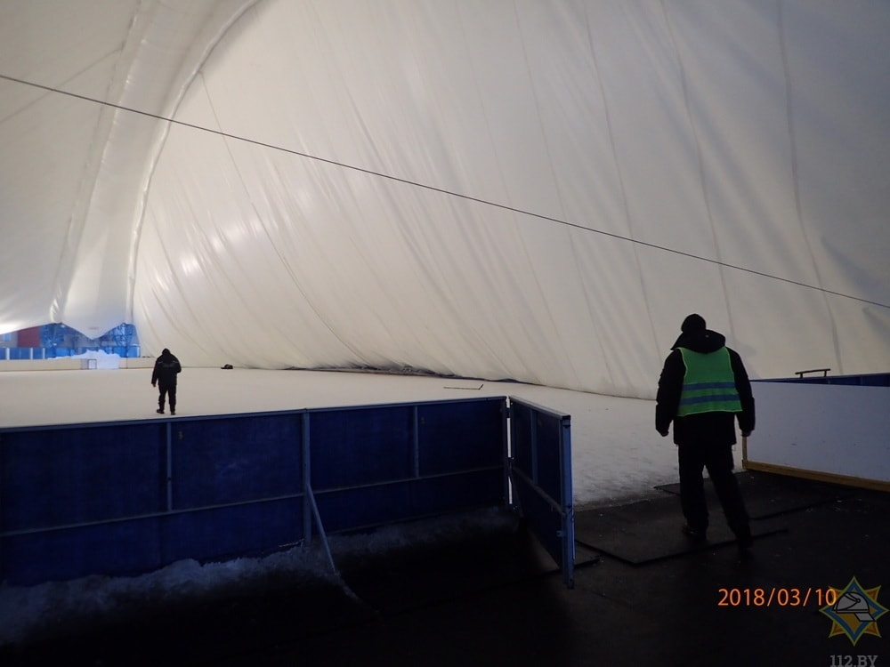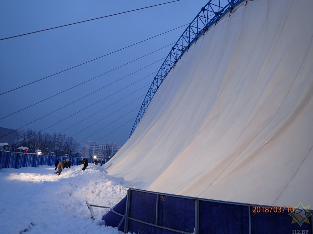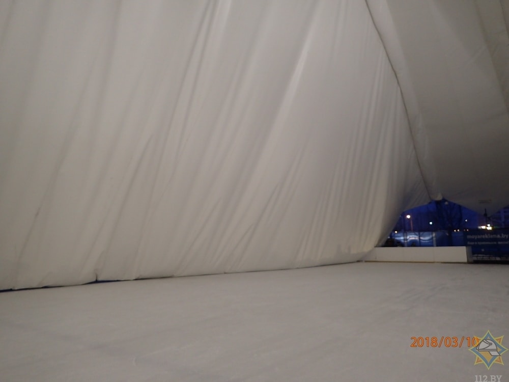 Каток, который расположен на Речицком проспекте, работает только в холодное время года. Его кровля представляет собой огромный тент, натянутый тросами. Половина этой крыши и оборвалась сегодня около 18:30.
