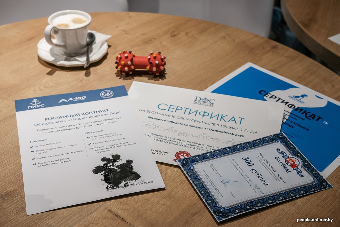 Дар внешне был доволен происходящим и принимал все свалившееся на себя внимание с достоинством породистой собаки. После всех стартовых процедур пес «подписал» (чисто технически — поставил отпечаток) лапой контракт на 1000 рублей, получил три сертификата от партнеров проекта (годовое обслуживание в студии груминга, обслуживание в ветклинике — тоже годовое, сертификат на 300 рублей для покупки зоотоваров).