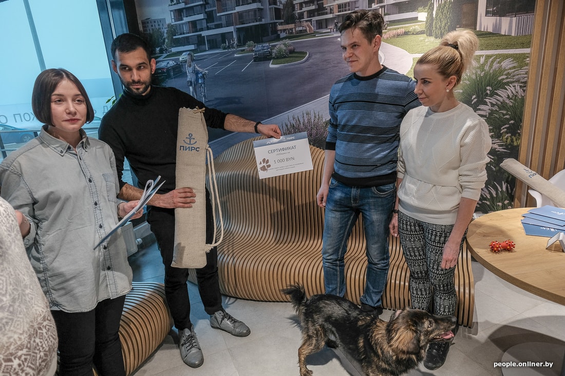 На церемонии собрались непосредственно победитель с хозяевами, представитель компании «А-100 Девелопмент» и волонтер благотворительной организации «Зоошанс». Последний привел друга — бездомную собаку Кари. Если хотите сделать Кари радость, пустите его к себе пожить. Кстати, на сайте организации есть и другие, не менее симпатичные животные, которым можно помочь.