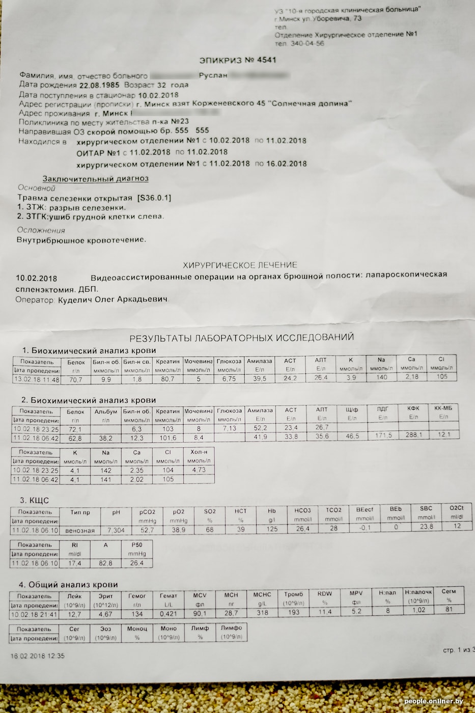 — Отвезли в 10-ю больницу, сделали рентген, анализ крови и УЗИ. Сначала рентген не показал перелома — значит, не ребро. Потом доктор на УЗИ подтвердил опасения: «Я не вижу краев селезенки, но вижу жидкость в малом тазу». Пешком вернулся в приемный покой. Появилась медсестра. Как только она услышала, что у меня разрыв селезенки, удивилась, как это я пешком дошел, и быстро убежала за каталкой. Дальше уже как в кино: ложишься, едешь куда-то, раздели, что-то спросили, и я заснул под действием морфия. Проснулся в 2:15 в реанимации уже зашитый.