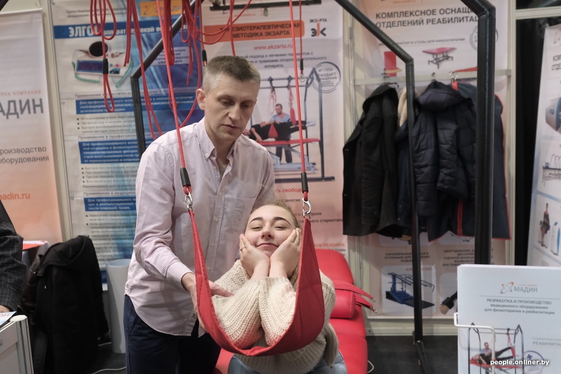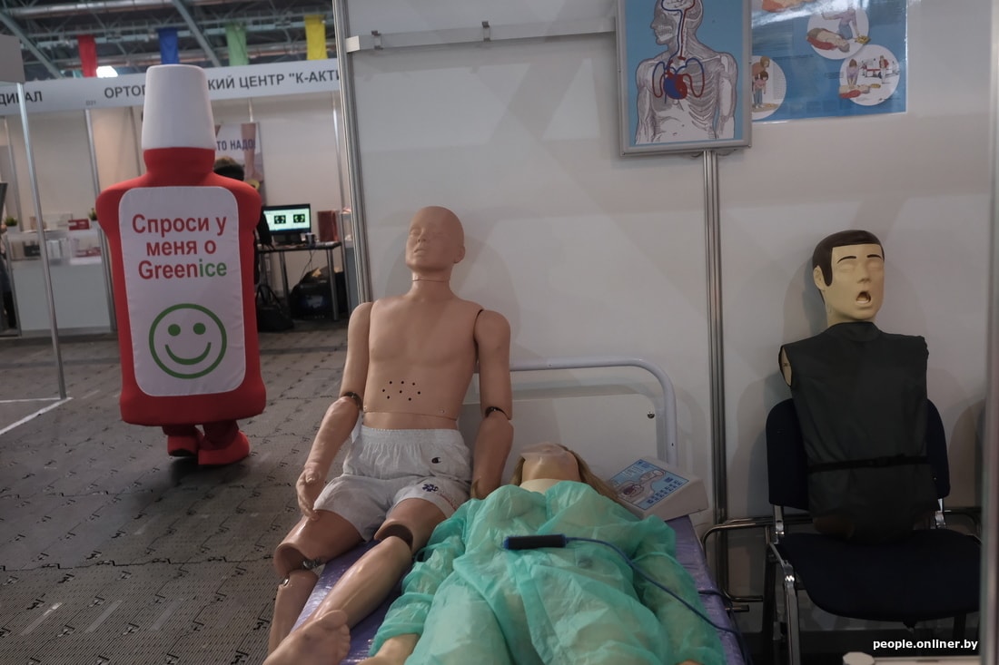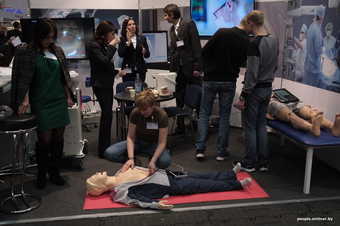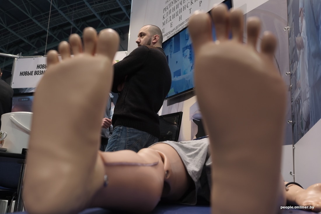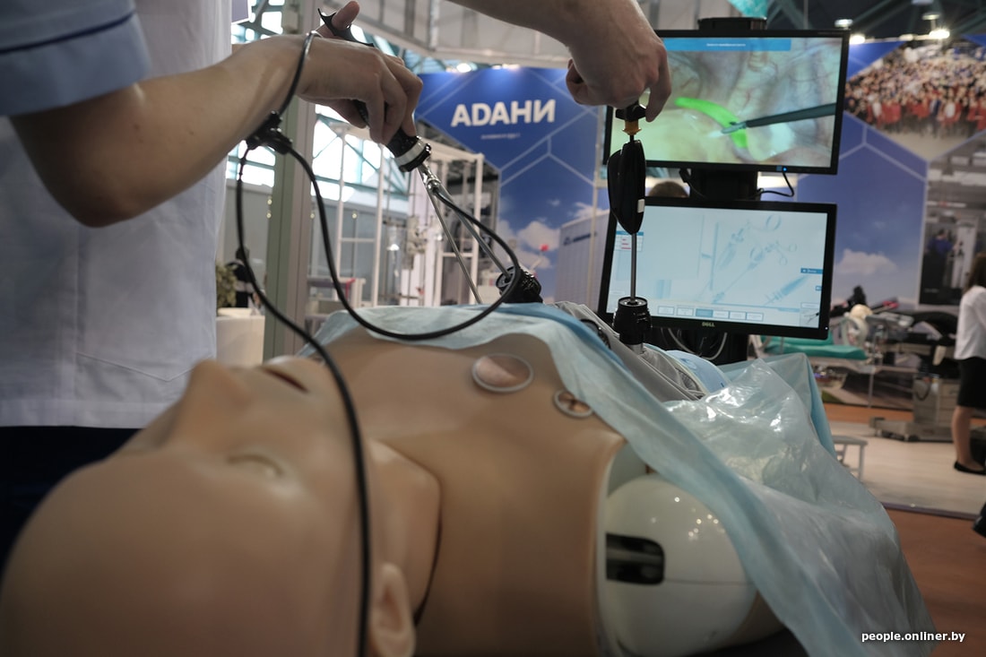 Неподалеку на стенде «Медтехноцентра» желающие с энтузиазмом проводят лапароскопическую аппендэктомию — удаляют аппендикс, значит. Не волнуйтесь, на кушетке не человек — максимально натурально воссозданный высокотехнологичный манекен.