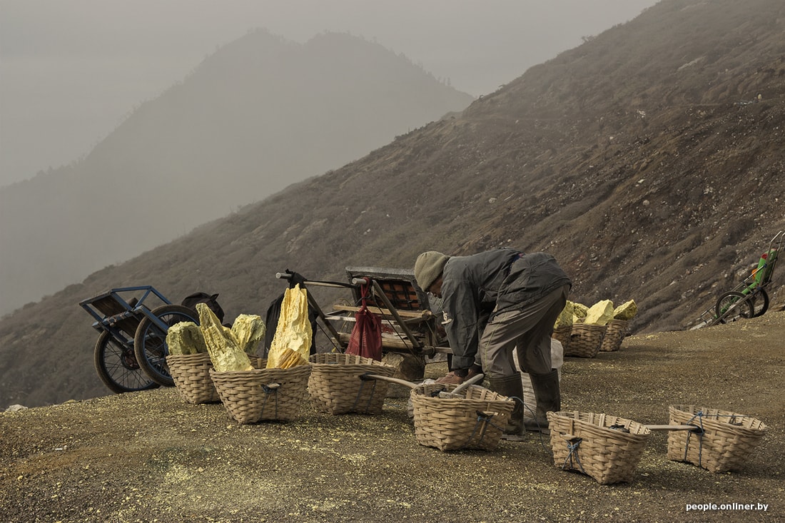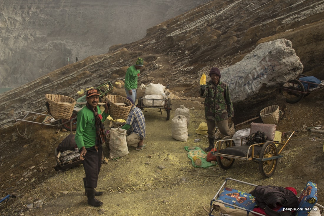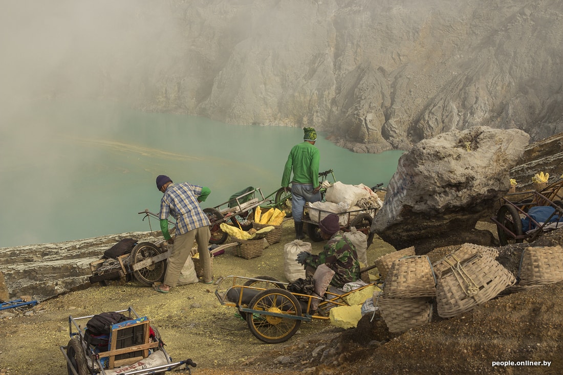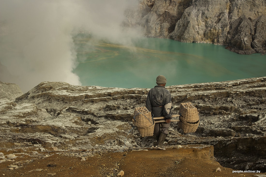 Дымящий кратер был залит кислотно-зеленым озером, у подножия которого копошились люди. Это шахтеры добывают серу открытым способом. Респираторы, сто лет как отработавшие свой ресурс, защищали сугубо психологически. В жутком чаду люди наполняли кусками серы большие корзины и сразу тащили их наверх. Там, переложив груз на тележки, шахтеры спускались с ними к подножию. Я машинально купил какую-то серную безделушку — скорее из желания помочь и завести разговор. Сорокалетний на вид мужчина оказался двадцатипятилетним парнем. В зависимости от количества рейсов его дневной заработок составляет от $5 до $10. Позже я узнал, что средняя продолжительность жизни шахтера составляет 45 лет. Я не уверен, что где-либо еще в мире увижу более тяжелую работу.