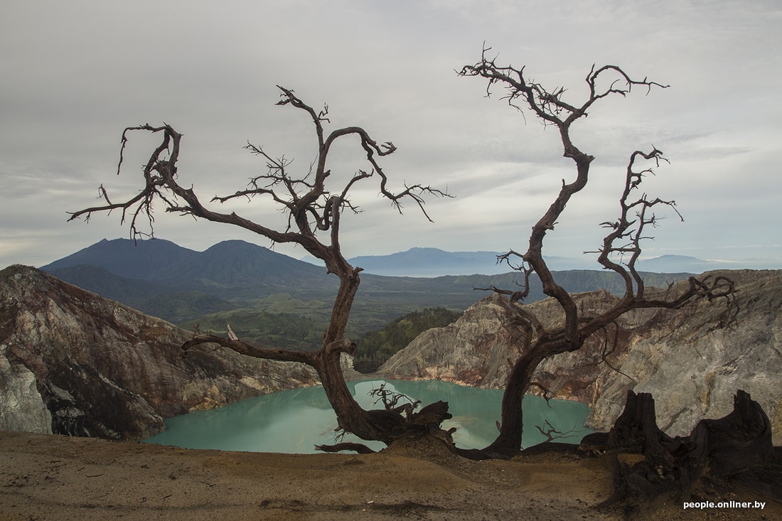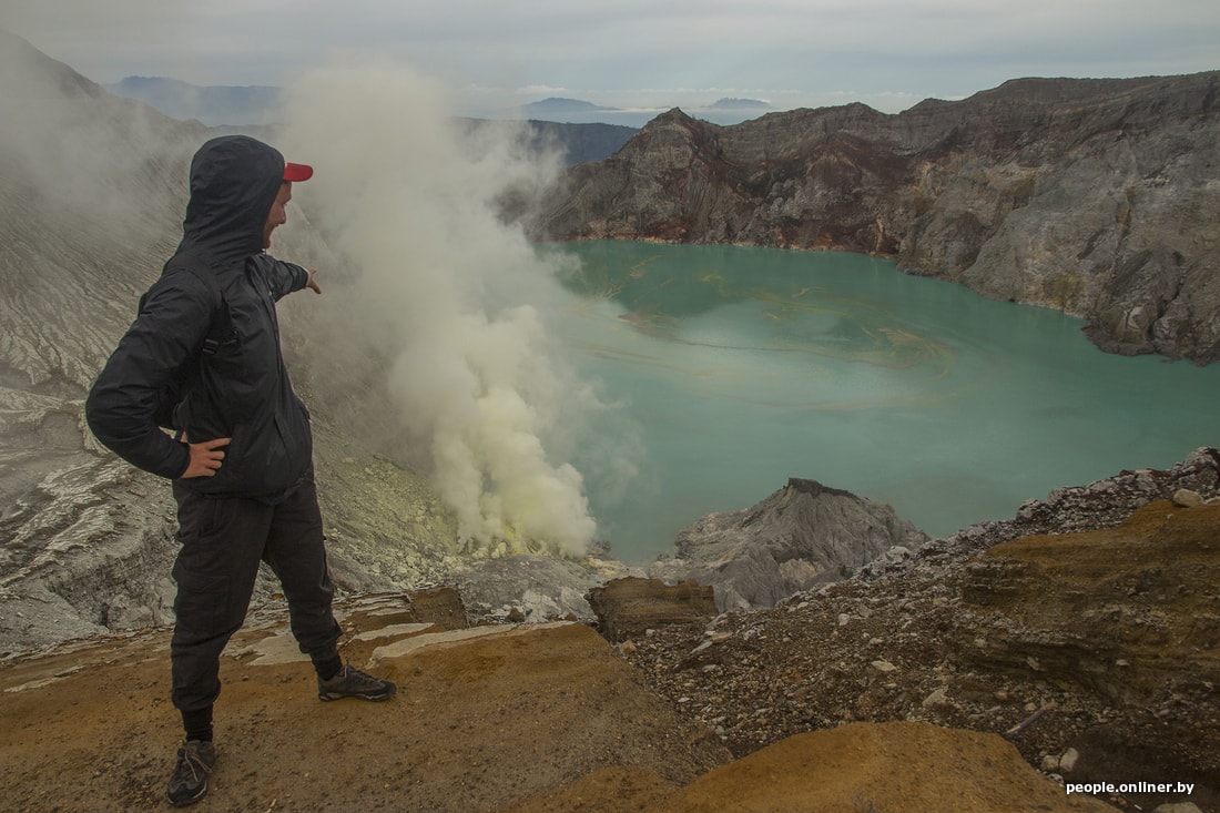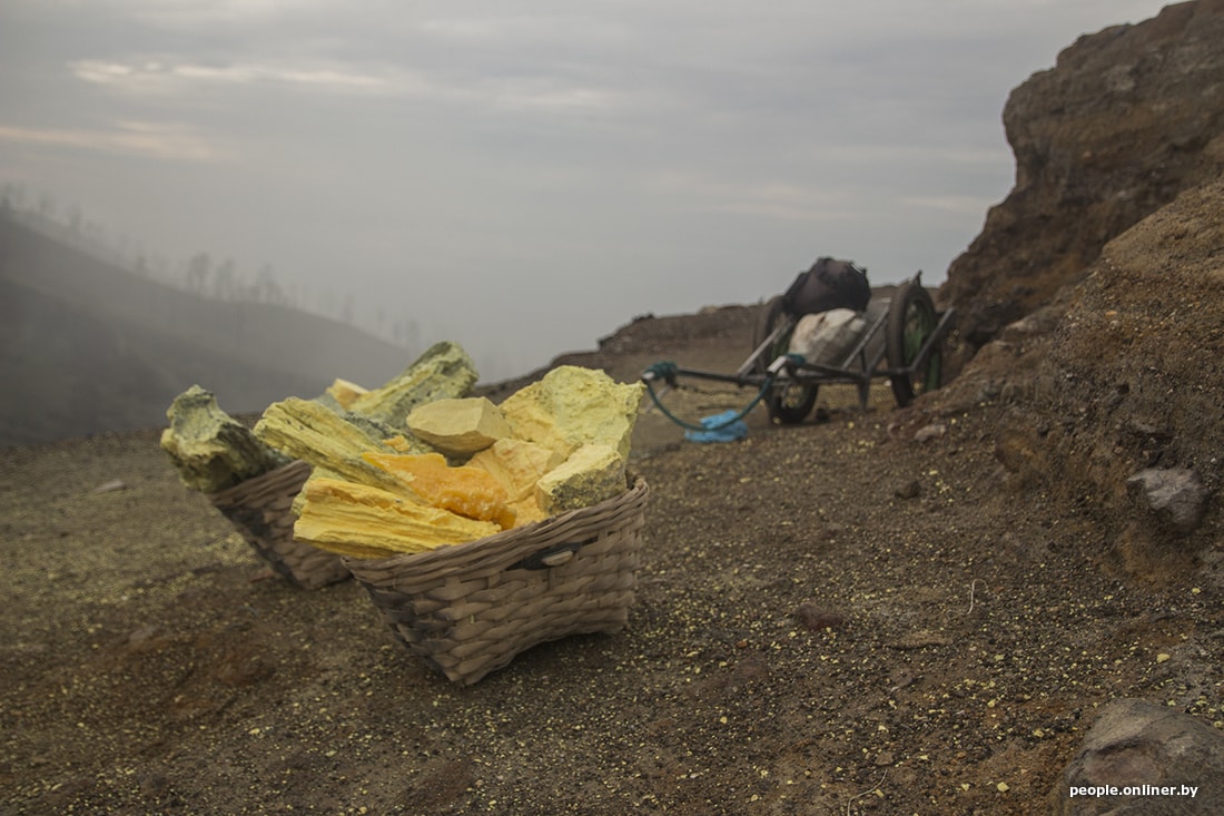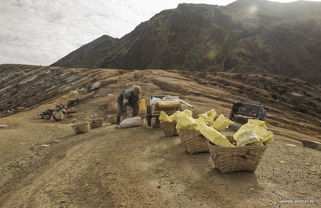 Дымящий кратер был залит кислотно-зеленым озером, у подножия которого копошились люди. Это шахтеры добывают серу открытым способом. Респираторы, сто лет как отработавшие свой ресурс, защищали сугубо психологически. В жутком чаду люди наполняли кусками серы большие корзины и сразу тащили их наверх. Там, переложив груз на тележки, шахтеры спускались с ними к подножию. Я машинально купил какую-то серную безделушку — скорее из желания помочь и завести разговор. Сорокалетний на вид мужчина оказался двадцатипятилетним парнем. В зависимости от количества рейсов его дневной заработок составляет от $5 до $10. Позже я узнал, что средняя продолжительность жизни шахтера составляет 45 лет. Я не уверен, что где-либо еще в мире увижу более тяжелую работу.