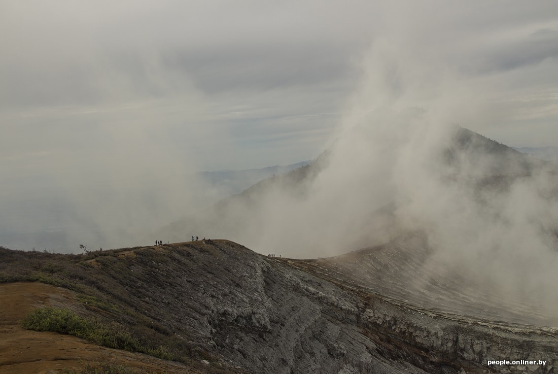 Я проснулся в половине четвертого, чтобы встретить рассвет у кратера вулкана Иджен. Не было и речи о том, чтобы мы сделали это вместе. Даже со здоровыми ногами это восхождение осилит не каждый. В этом я убедился, наблюдая, как местные спускали на носилках крепкого парня. Крутой подъем усложнялся еще и удушливым серным газом. Увиденное сверху потрясло меня до самой глубины души. Картина была инопланетная.