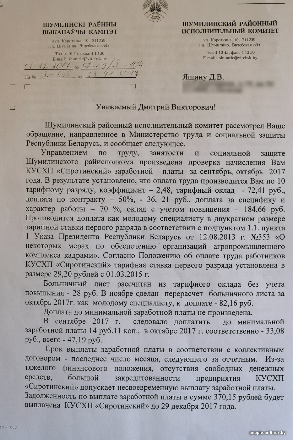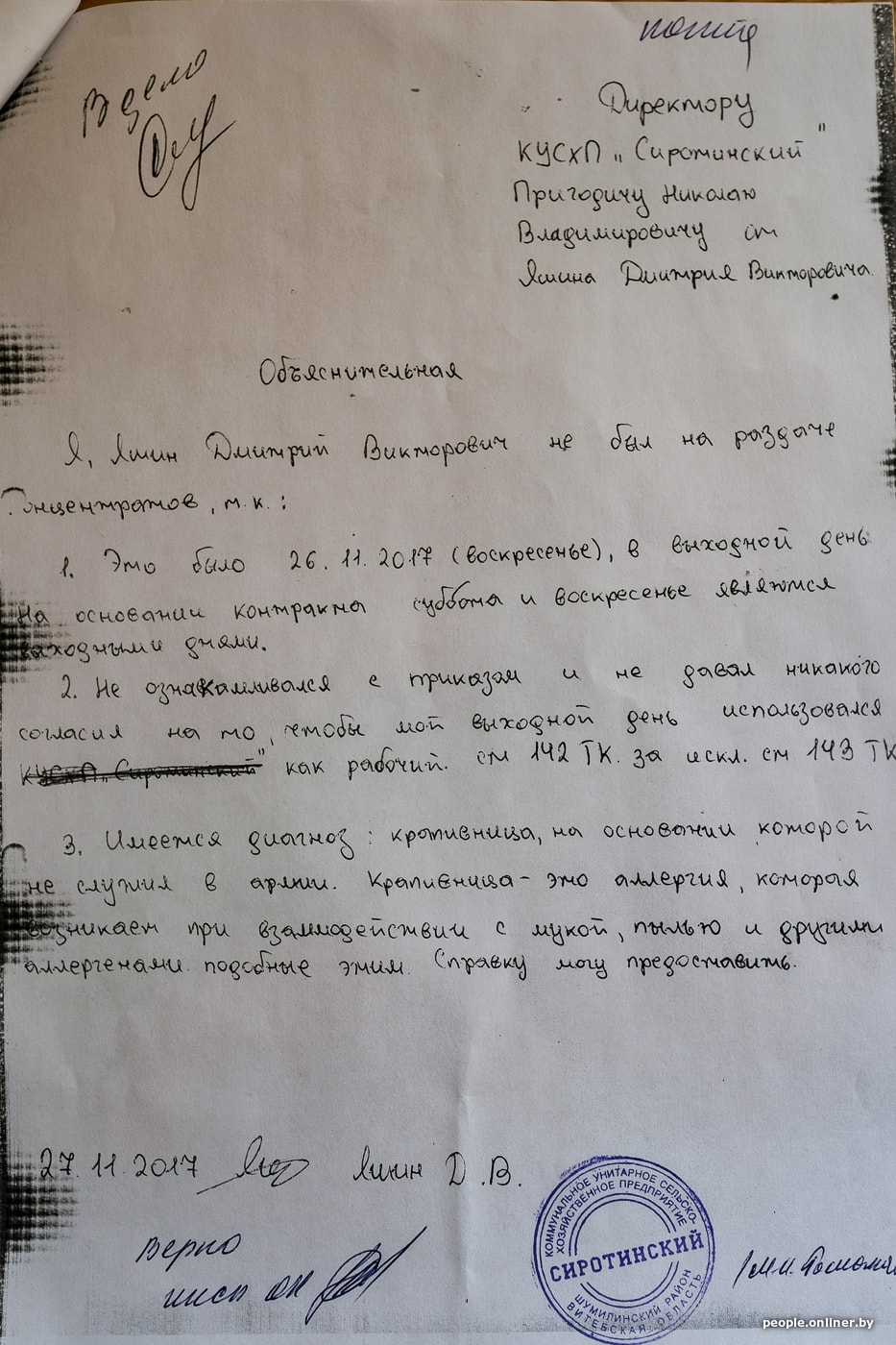 — Вы сейчас спрашиваете: а почему я согласился поехать в колхоз с окладом в 189 рублей? Разве не понимал, какая там ситуация? Почему не нашел другое место для отработки оставшегося срока распределения? А других вариантов просто не было. Я ходил, звонил, искал, узнавал по вакансиям — везде одно и то же: мест нет, зарплаты низкие. Так я и пришел в «Сиротинский». Знакомый уже распределился туда и предложил мне присоединиться. Я начал работать в колхозе (официальное его название — коммунальное унитарное сельскохозяйственное предприятие «Сиротинский») 20 сентября 2017 года бухгалтером по учету товарно-материальных ценностей. Я парень городской, родился и всю жизнь провел в Полоцке, а потому первое время у меня был шок. Делать молодежи в агрогородке Слобода абсолютно нечего. Все пьют. Горячая вода — только зимой. Но это мне с приятелем еще повезло, мы жили в квартире, и там хотя бы топить не нужно было. Спасибо бухгалтеру.