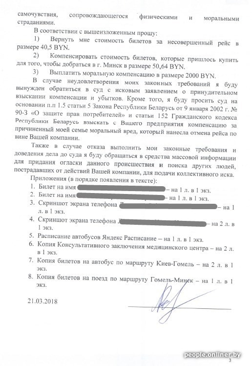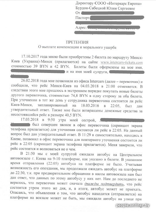 — Однако за 5 дней до отправления нам позвонили и сказали, что рейс Минск — Киев отменяется по техническим причинам, предложили приехать в офис, чтобы забрать деньги, потраченные на билет в одну сторону. Выбора особо у нас не было: приехали, забрали деньги, оставили «заметку про вашего мальчика» в книге жалоб, купили билеты нашего родного «Минсктранса» (благо оставалось несколько мест на нужный нам день) и в назначенный день успешно прибыли в Киев.