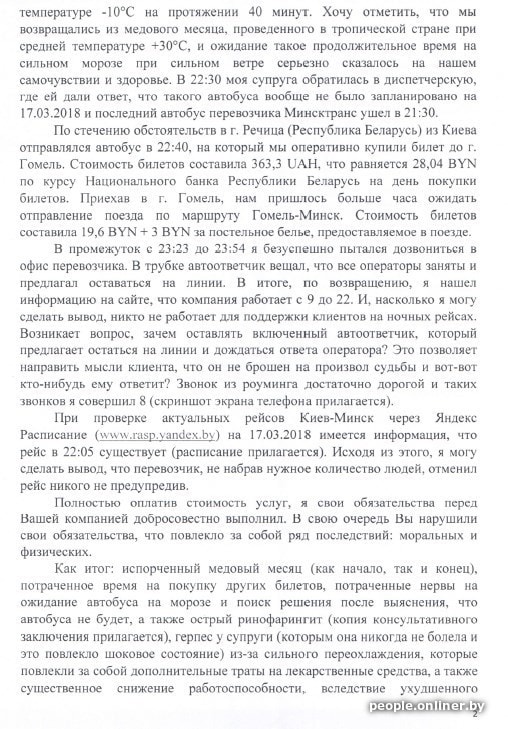 История про смазанный отпуск. Молодожены прилетели в Киев и собирались обратно в Минск. Но вышло так, что из этого ничего не вышло. Автобус, на который загодя были куплены билеты, не приехал. Ребята как-то добрались в РБ, после чего написали жалобу. Билетный оператор согласился оплатить неиспользованные и использованные билеты, но компенсировать моральный вред отказался. Мол, запрошенная сумма слишком космическая.