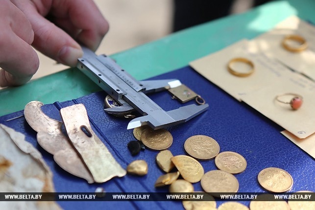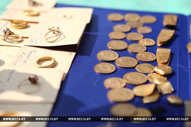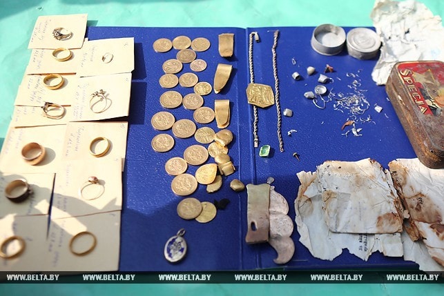 В коробочке было около 30 золотых монет XVIII—XIX веков, свыше 10 различных драгоценных украшений — кольца и цепочки, а также документы, в том числе и закладные начала XX века. Ценность клада пока неизвестна, специалистам необходимо изучить находку. По имеющейся информации, это самый крупный клад, найденный в Гродно за последнее время.