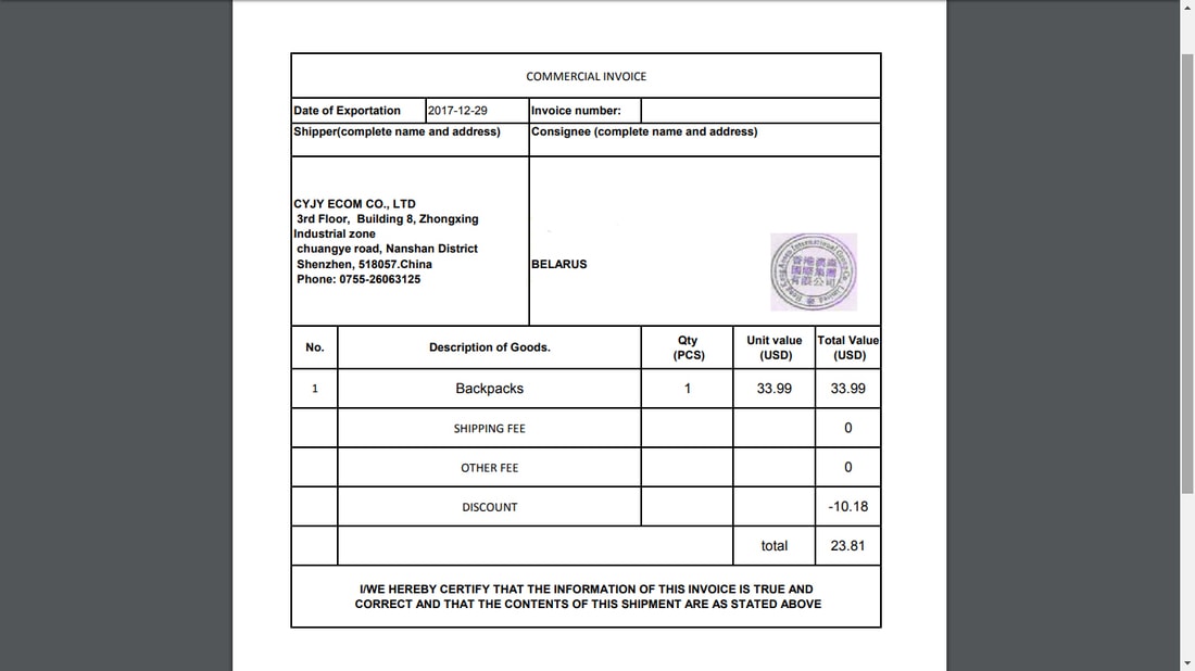 — Рюкзак я покупал во время флешсейла, он обошелся мне в $23,81, — рассказал Onliner.by Дмитрий. — Во время получения посылки я узнал, что продавец задекларировал изначальную стоимость товара без акции — $33,9. Это было для меня полной неожиданностью. На рюкзак начислили таможенную пошлину и остальные сборы — всего 19 рублей 80 копеек.