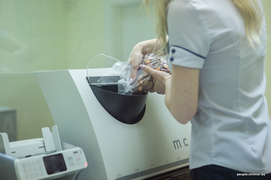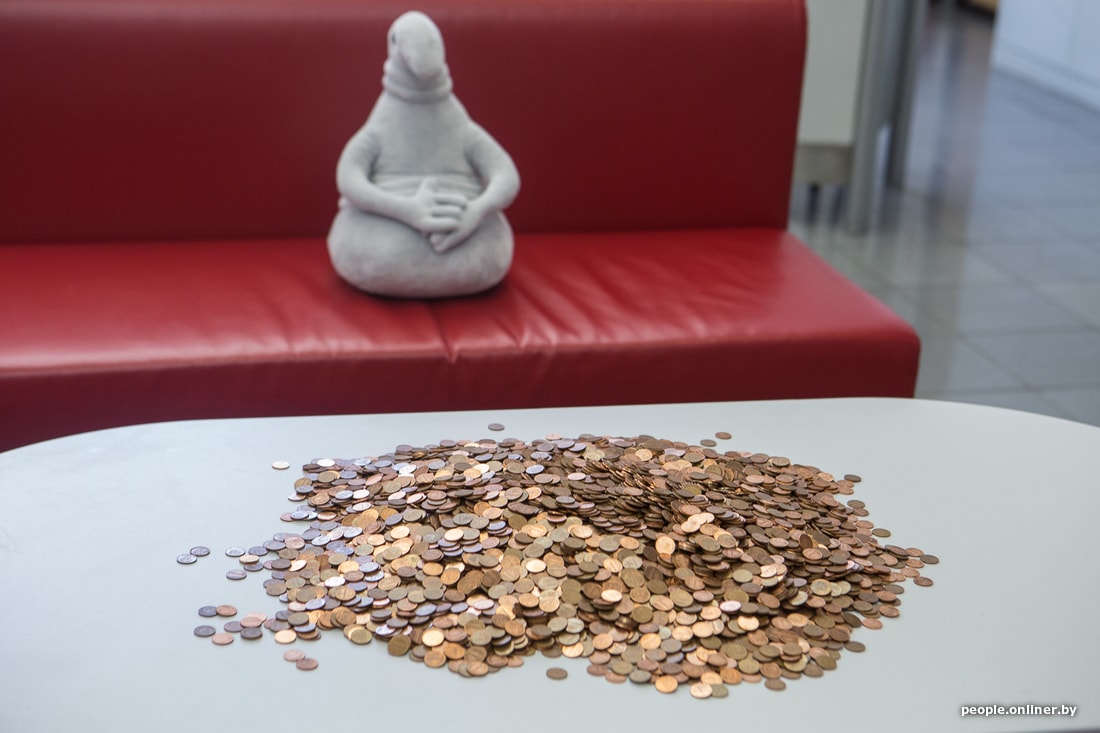 Мы пересыпаем монеты в пакеты. Многие из копеек уже потемнели, покрылись пятнами. Кассир принимает мешочки с деньгами и засыпает их в счетную машинку. Примерно 20—25 минут — и Владимир узнает точное количество «копеек» в своей копилке. Их там 8436 штук, или 84 рубля 36 копеек. Деньги Владимиру зачисляют на карточку.