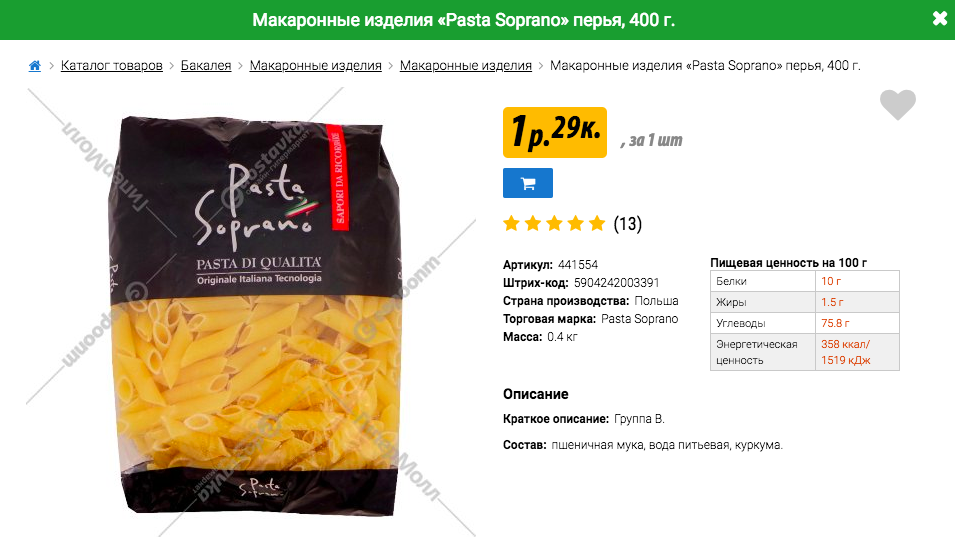 | Макароны-перья Pasta Soprano (0,4 кг) | 1,85 | 1,29 (−30%) |