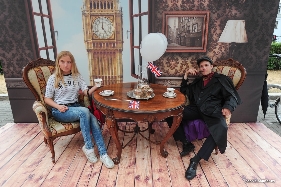 Кроме сцены и точек с едой, для посетителей подготовили и большую зону активности. К примеру, можно сфотографироваться в антураже королевского дворца или с гвардейцами, охраняющими Букингем. А еще с Джудом Лоу, к примеру. А потом пойти и подстричься в английской парикмахерской.
