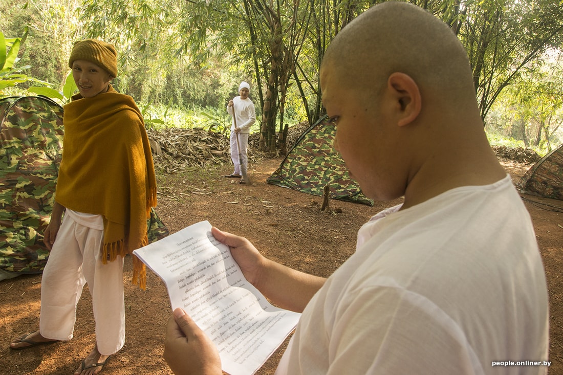 Возвращаясь в тренировочный лагерь, мы имели около двух часов свободного времени. Кто-то сразу падал в палатку, кто-то лез на гору за интернетом, кто-то стирал, но основная масса корпела над текстами, которые нужно было выучить перед церемонией. Ребята волновались. Для тайцев это важное мероприятие, на котором будет весь город, включая их родню.
