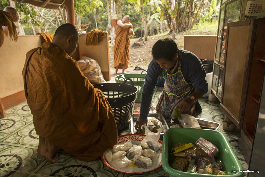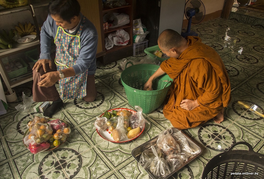 Центральная улица города, шесть тридцать утра. Мы втроем босиком идем по обочине. Тротуаров нет. Желающие сделать подаяние выходят с едой, разложенной на подносах. Без лишних слов мы подставляем котелки, после чего затягиваем благодарственную мантру. Сопровождающий нас таец помогает перекладывать все в корзины, стоящие в кузове пикапа. Обычно выходят одни и те же, и уже через несколько дней знаешь, что пожертвует каждый. Толстенький кондитер — пирожные, продавец фруктов — манго и папайю, автомеханик — рис с мясом, повариха из кафешки — три пакета с супом. После завершения обхода нас отвозили обратно, где мы сортировали «улов» и готовились к трапезе. Съедая лишь малую часть, мы отправляли еду в деревню, где она раздавалась нуждающимся.