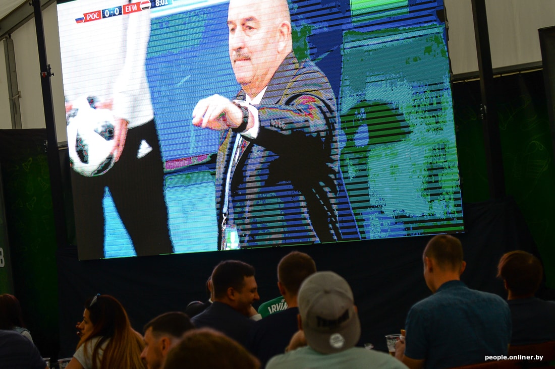 За этой игрой прямо в центре Минска смотрели несколько сотен местных болельщиков. Поддерживали в основном россиян. Новая фан-зона заработала на Октябрьской площади с 19-го числа.
