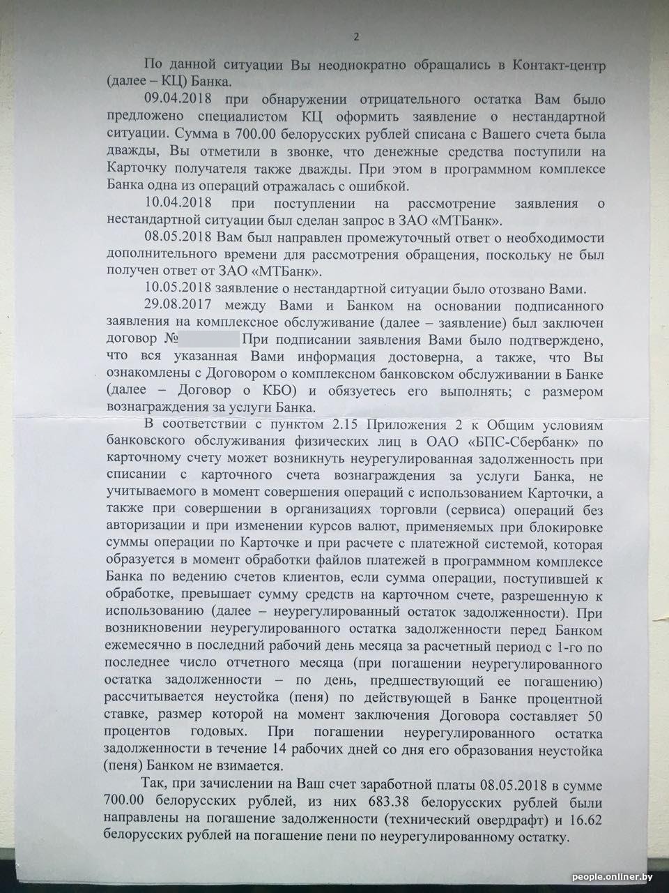 — Согласно пункту 2.15 если возникает неурегулированный остаток задолженности перед банком, то рассчитывается неустойка по действующей в банке процентной ставке, размер которой на момент заключения договора составляет 50 процентов годовых. При погашении неурегулированного остатка задолженности в течение 14 рабочих дней со дня его образования неустойка (пеня) банком не взимается, — отмечается в письме. — Так, при зачислении на ваш счет заработной платы 8 мая в сумме 700 белорусских рублей, из них 683 рубля 38 копеек были направлены на погашение задолженности (технический овердрафт) и 16 рублей 62 копейки на погашение пени по неурегулированному остатку. При зачислении заработной платы 15 мая была погашена пеня в сумме 13 рублей 34 копейки.