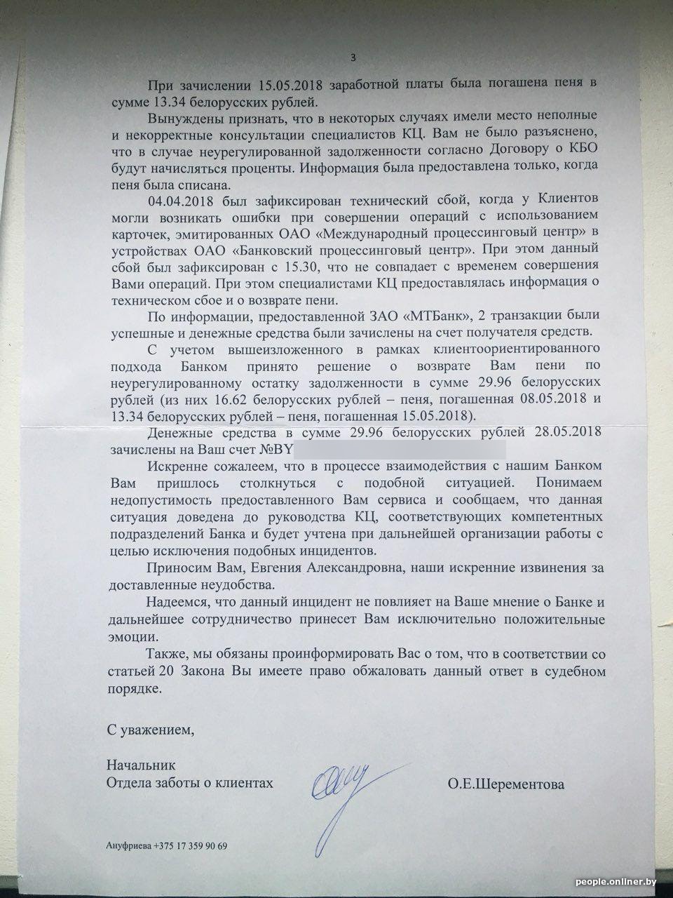 — По информации, предоставленной ЗАО «МТБанк», две транзакции были успешные и денежные средства были зачислены на счет получателя средств, — говорится в письме. — С учетом вышеизложенного в рамках клиентоориентированного подхода банк принял решение о возврате вам пени по неурегулированному остатку задолженности в сумме 29,96 белорусского рубля. Денежные средства в сумме 29,96 белорусского рубля 28 мая зачислены на ваш счет. Искренне сожалеем, что в процессе взаимодействия с нашим банком вам пришлось столкнуться с подобной ситуацией.