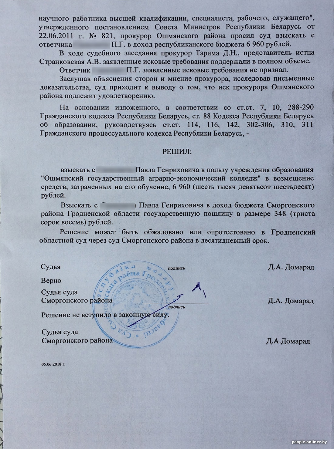 Оказалось, что решение КС Павел трактовал неправильно. В марте выпускник получил бумаги с требованием оплатить затраты за свое обучение — 6960 рублей. Он отказался. В мае состоялся суд, который стал на сторону колледжа. И к сумме обучения добавил еще 348 рублей госпошлины в доход государства.