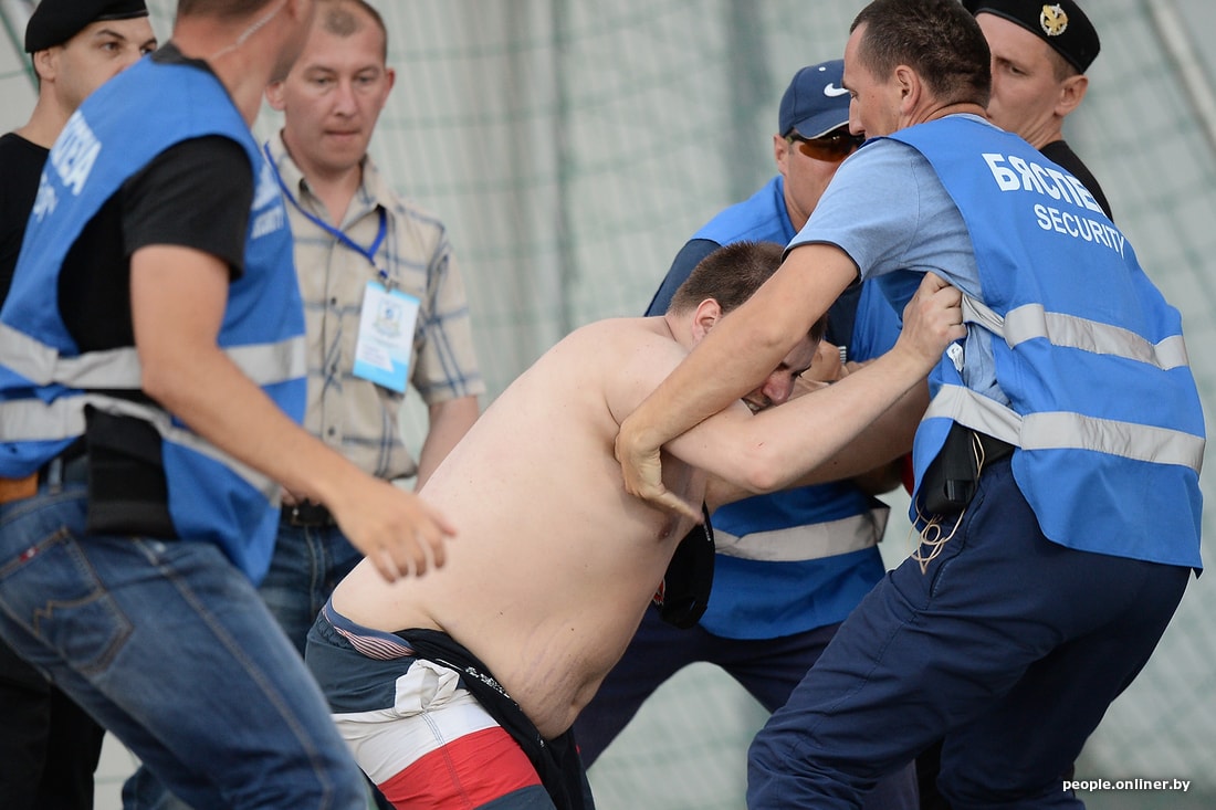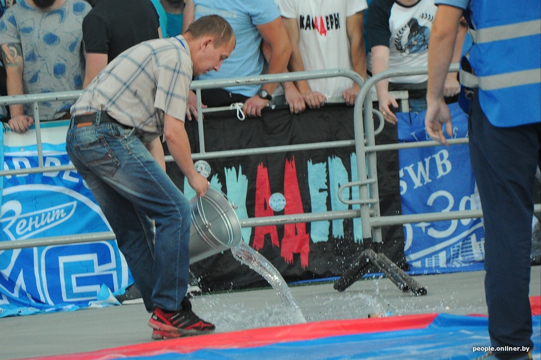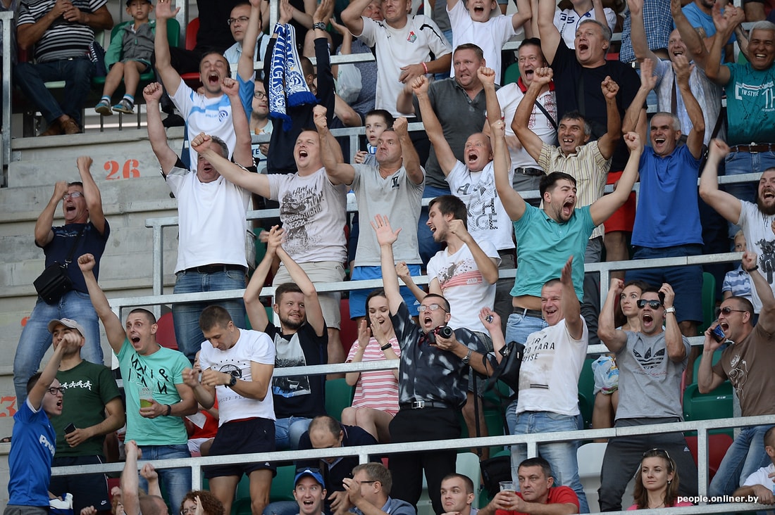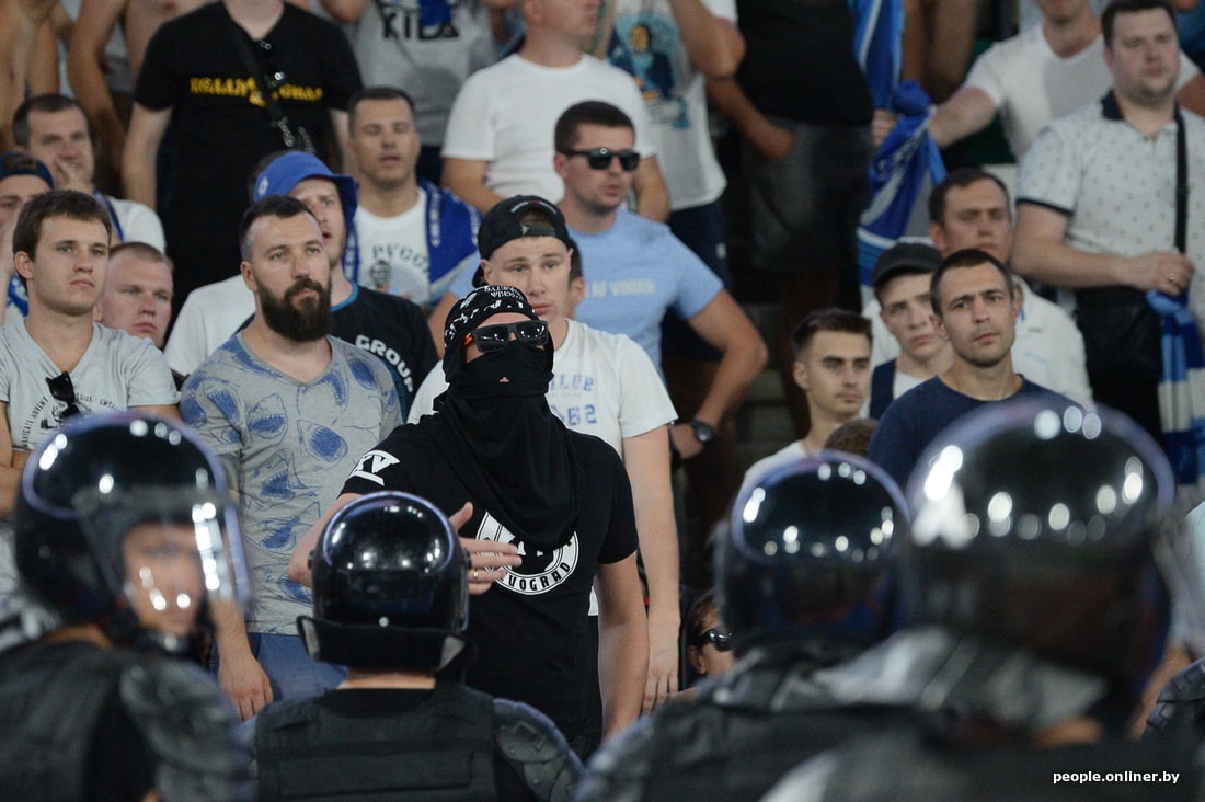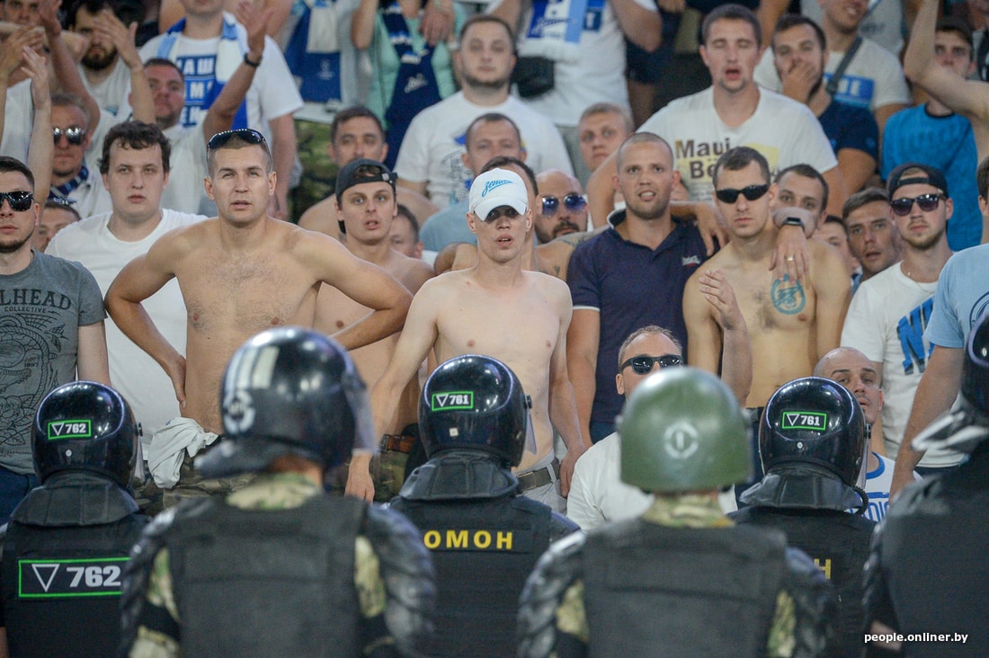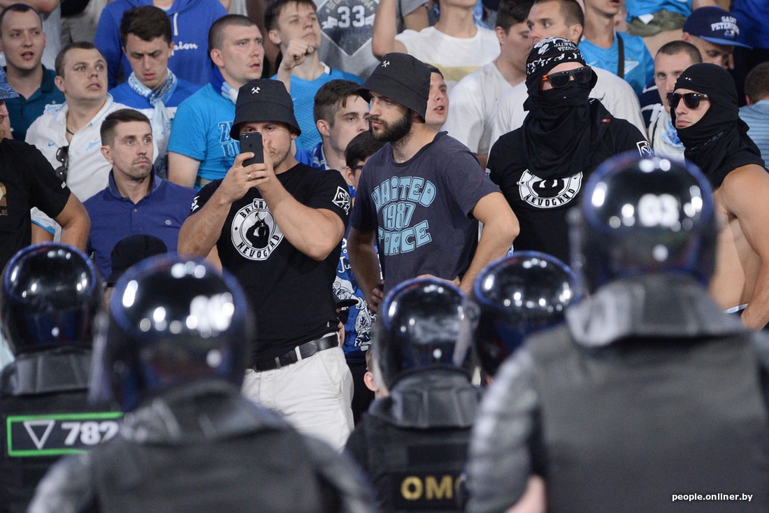 В первом тайме можно было до прихода надышаться недавней стройкой (стадион-то свежий) и послушать строевое пение приезжих болельщиков. Представители культурной столицы РФ умело пели про Катюшу и WWW — Ленинград. Минская публика поначалу парировала разрозненными выкрикиваниями. Организованная часть болельщиков «Динамо» бойкотирует матчи своей команды с прошлого года.