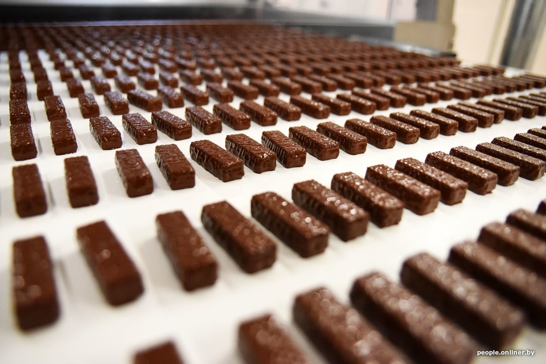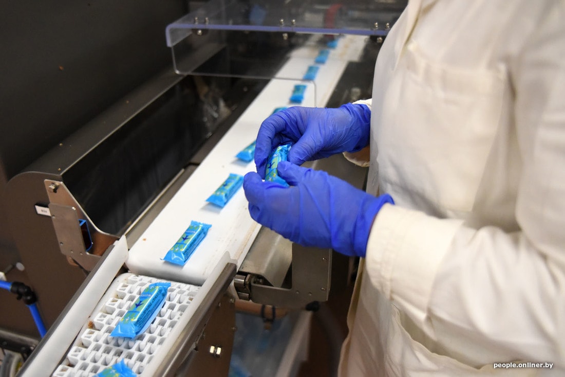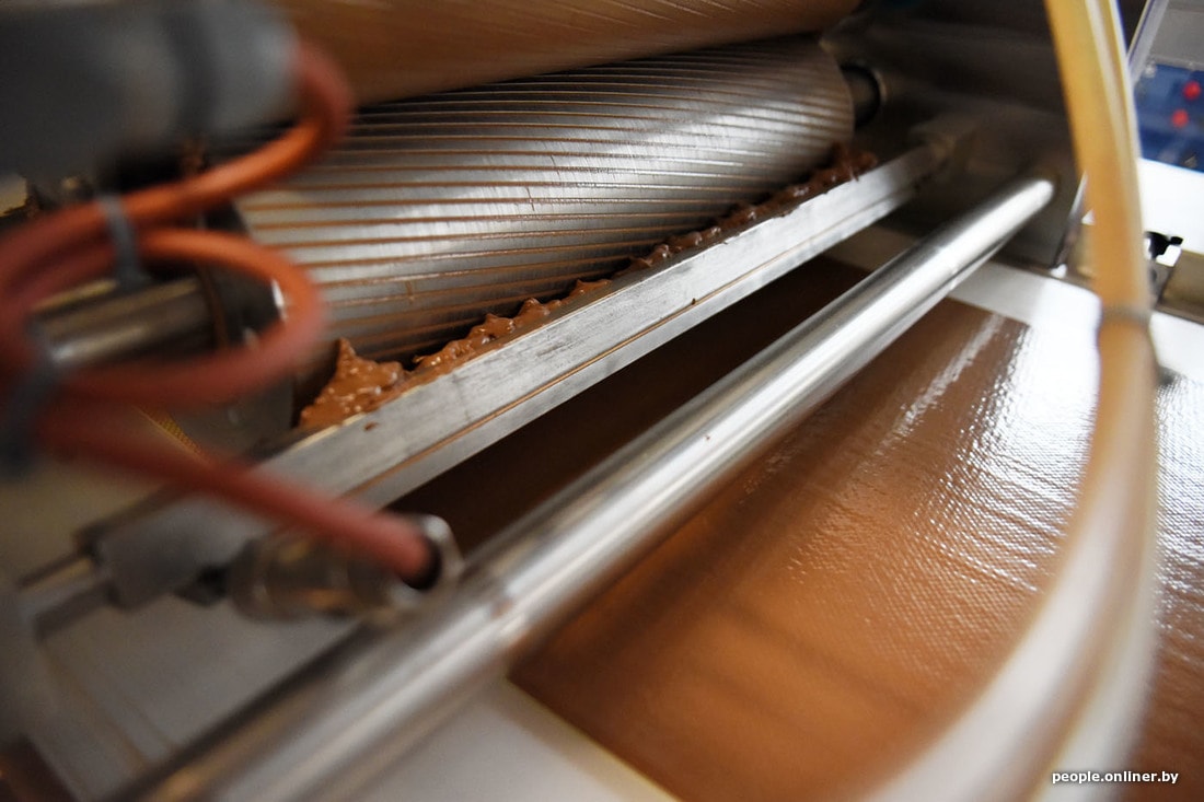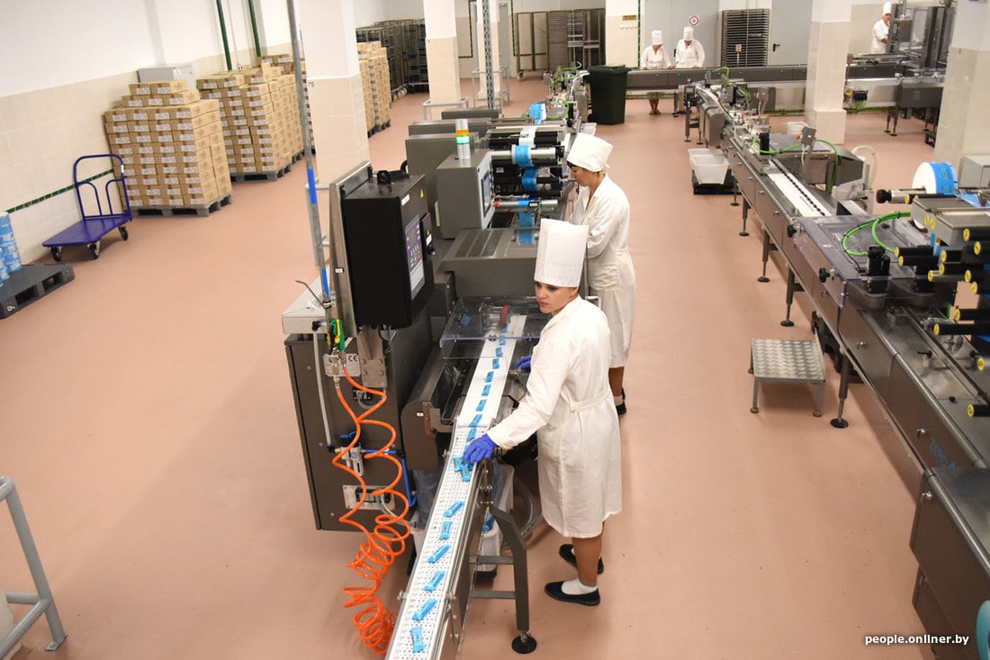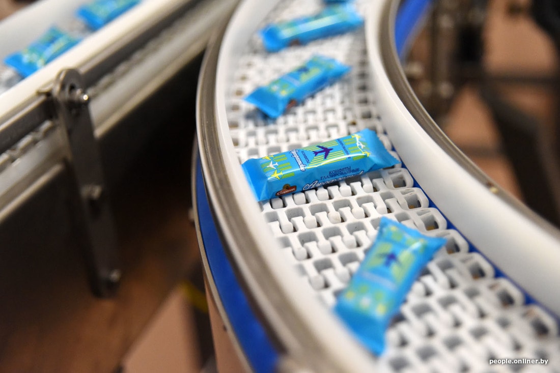 Производительность новой линии — 570 килограммов (конфет, батончиков) в час. Говорят, страна вполне успевает съесть, на складе продукция не лежит. Сегодня цех работает в одну смену (8 часов), хотят перевести на круглосуточный режим. Огромный цех с примыкающими помещениями и оборудованием обслуживают 18 человек.
