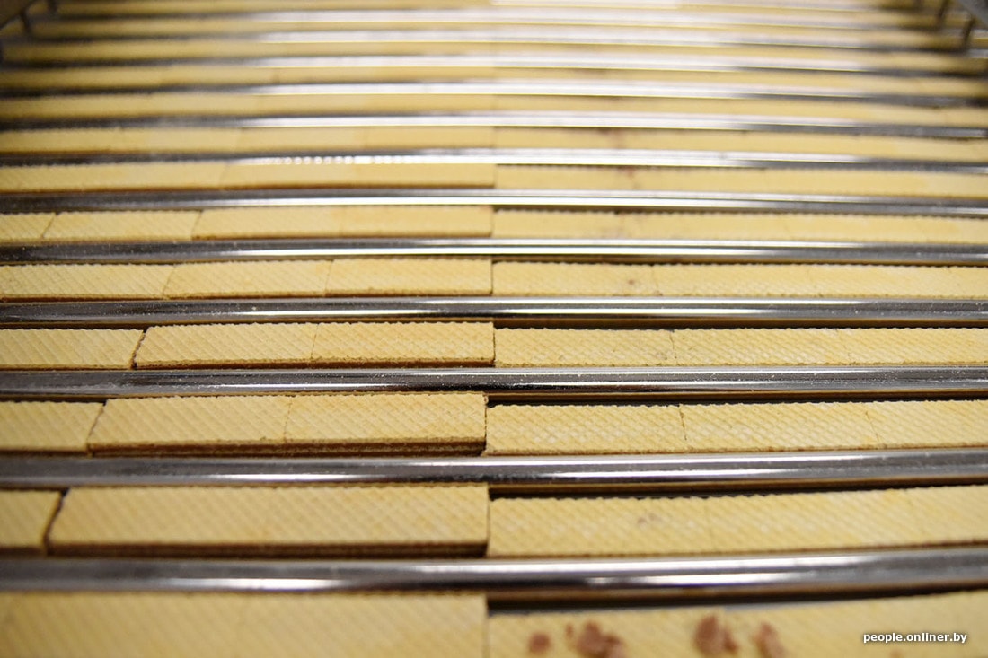 Дальше тесто идет по трубе в печь. Дозатор наливает порцию на красивую рифленую плиту, вторая все это накрывает. 102 секунды на выпечку при температуре 170 градусов, производительность агрегата — 24 листа в минуту, как у принтера.
