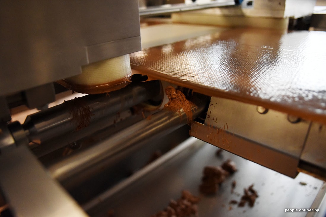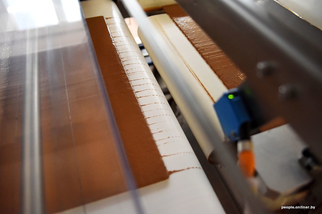 Следующий этап — остывание в специальной арке. Все происходит в движении. Также листы увлажняются, это предохраняет их от расслаивания при нанесении начинки и глазури.