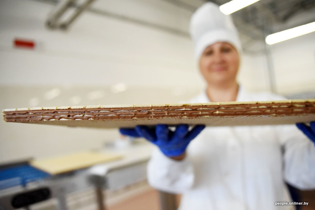 Начинка выдавливается на вафельный лист. Все это собирается в пласты (для «Аэрофлотских» — 4 листа, 3 слоя начинки). Соотношение по весу – 15 на 85 процентов.