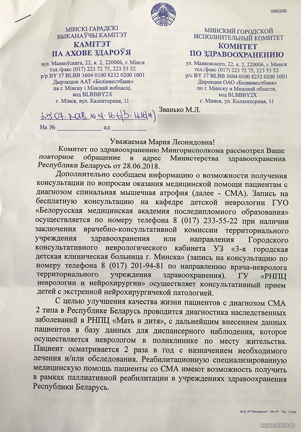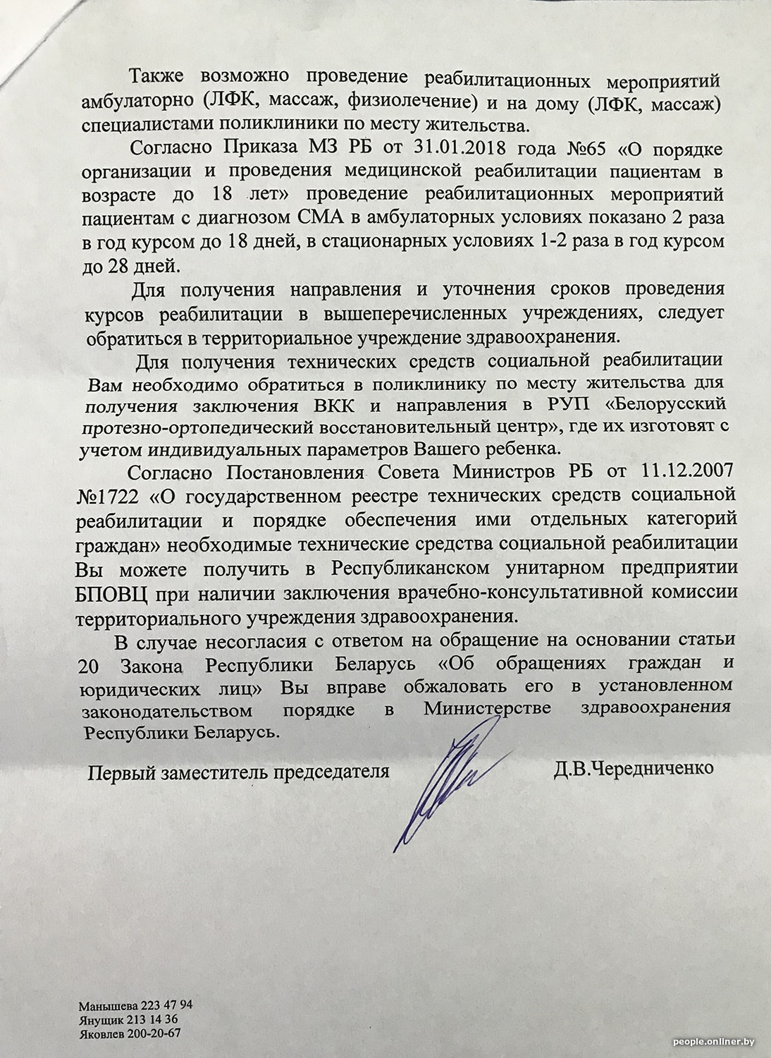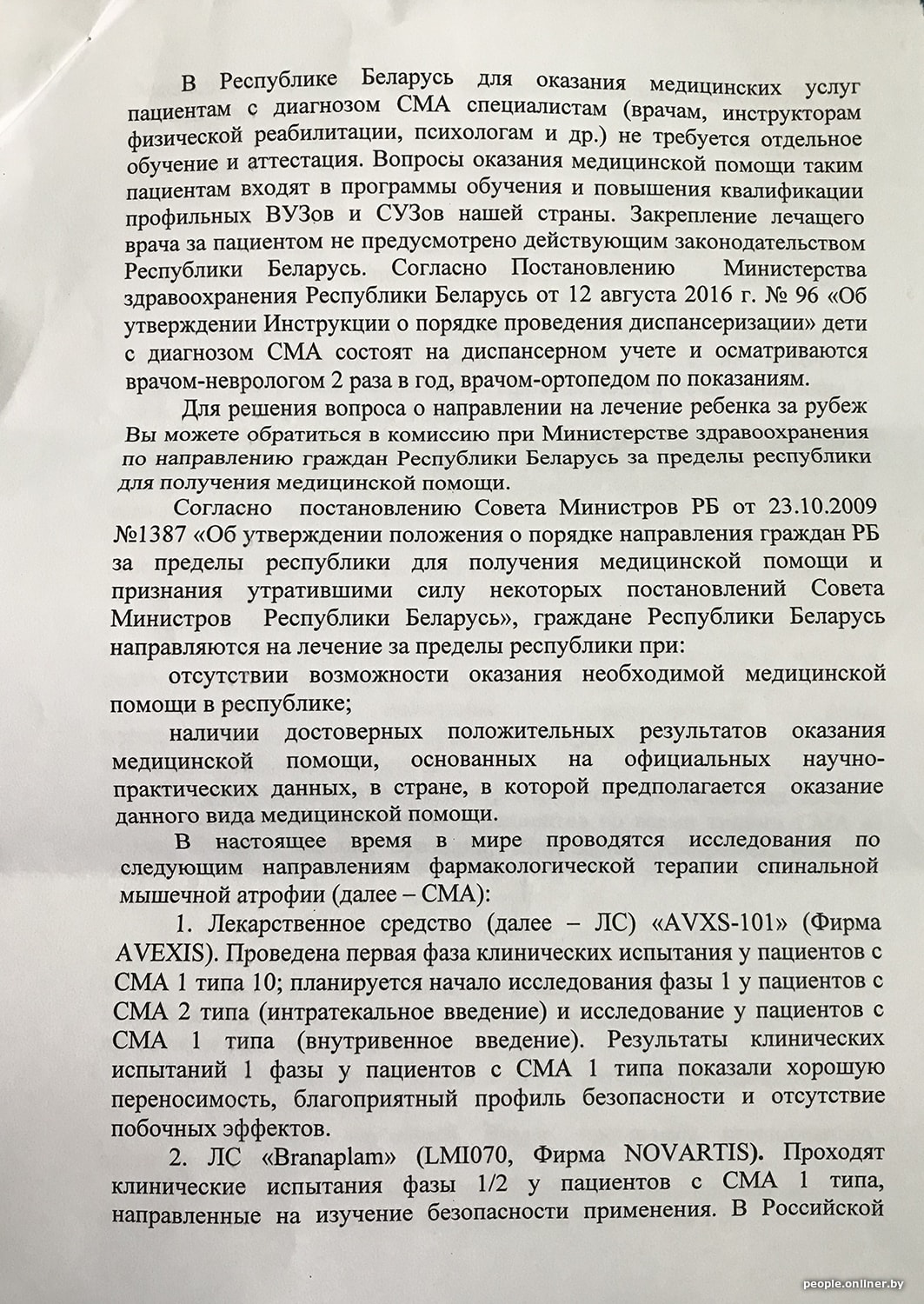 Чтобы не терять времени в переписке, они сразу же решили задать их Минздраву. Ребята сформулировали несколько вопросов, касающихся того, где получить квалифицированную консультацию по заболеванию, какая работа ведется в стране по улучшению качества жизни детей с СМА, можно ли получить эффективную медпомощь в Беларуси или в другой стране, какие средства реабилитации положены девочке, какие есть лекарства и так далее.