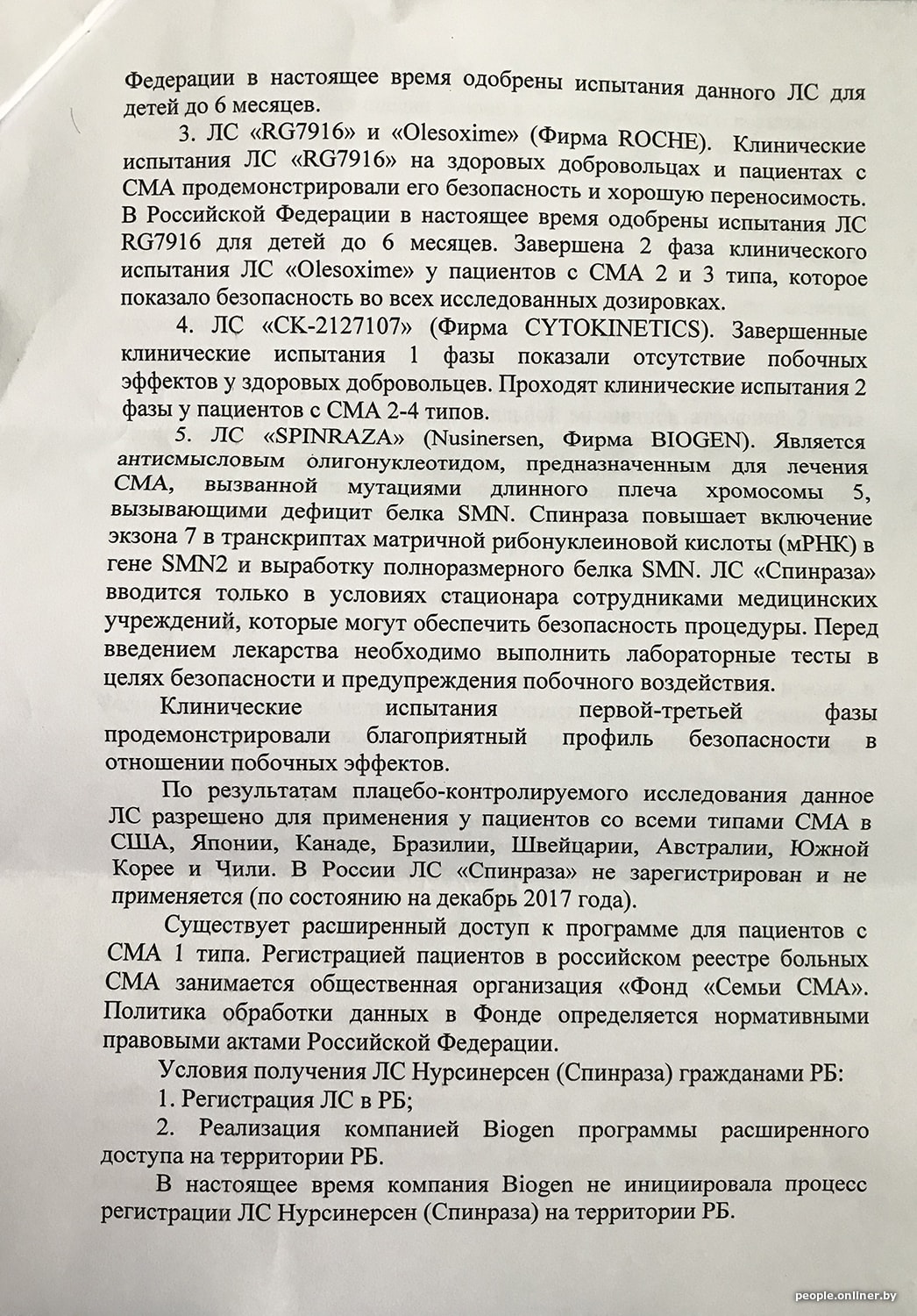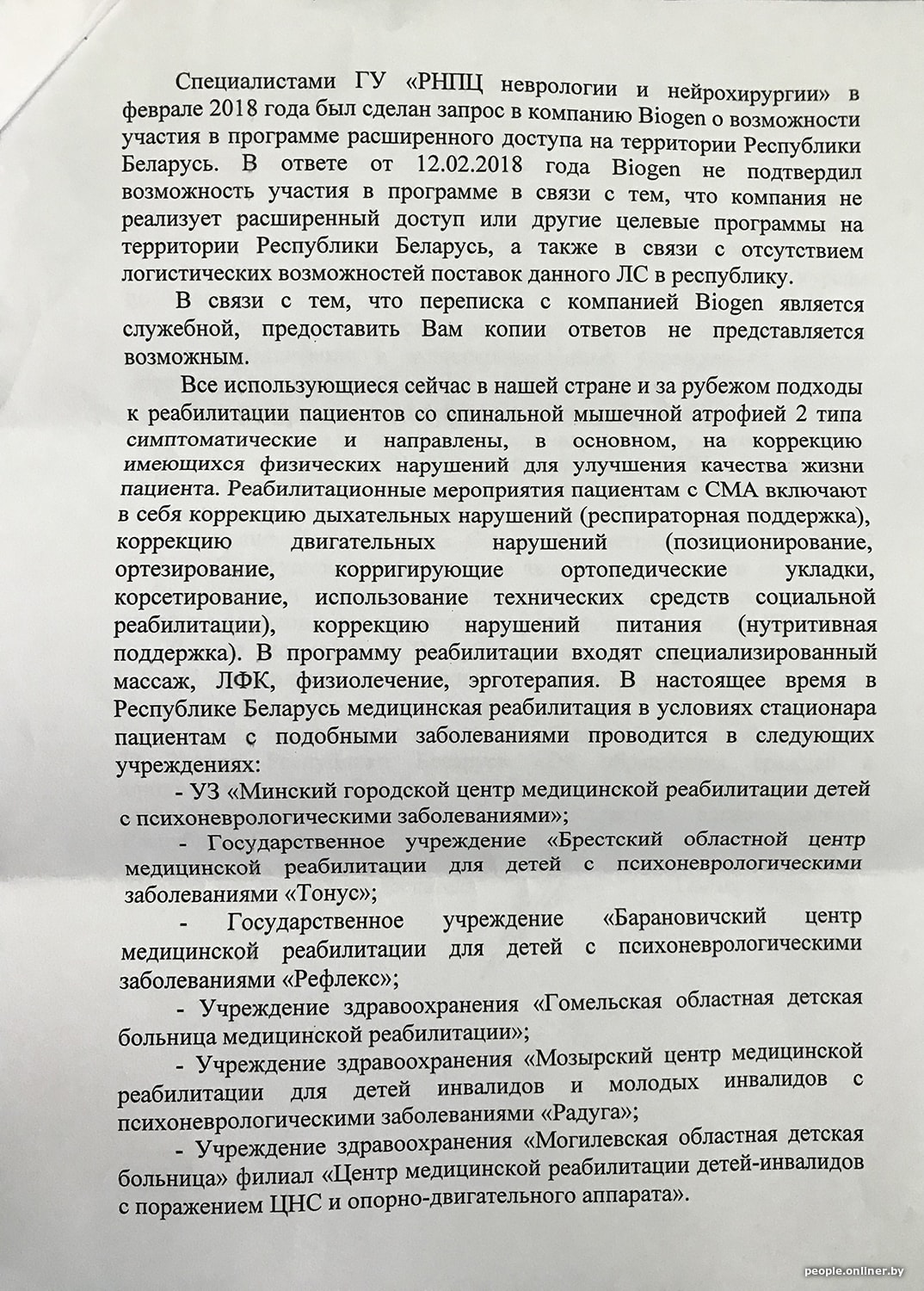 — Специалистами ГУ «РНПЦ неврологии и нейрохирургии» в феврале 2018 года был сделан запрос в компанию Biogen о возможности участия в программе расширенного доступа на территории Республики Беларусь, — сообщили в комитете. — В ответе от 12 февраля Biogen не подтвердил возможность участия в программе в связи с тем, что компания не реализует расширенный доступ или другие целевые программы на территории Республики Беларусь, а также в связи с отсутствием логистических возможностей поставки данного лекарственного средства в республику.