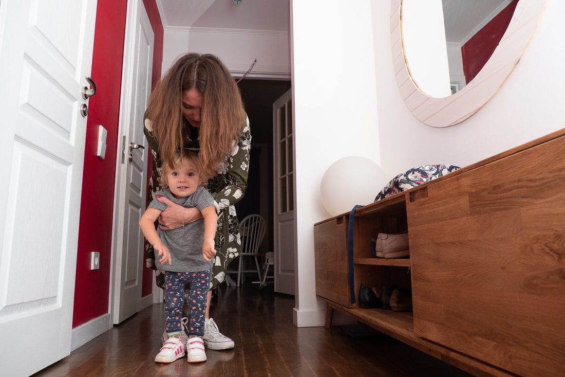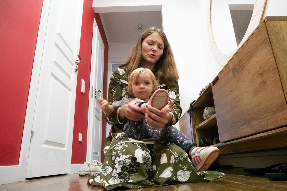 Мы идем по улице Есенина и периодически останавливаемся: Вера то просится на руки, то хочет катить велосипед или «потопать». Тогда молодая мама аккуратно как бы присаживает дочь на руки, чтобы девочка легко касалась ногами асфальта.