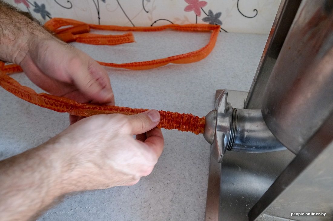Достаем шприц — обычный бытовой из «хирургической стали». Закидываем в емкость фарш, крутим ручку — мясо по трубке набивает оболочку. И получаются «просто-просто-просто сосиски!».