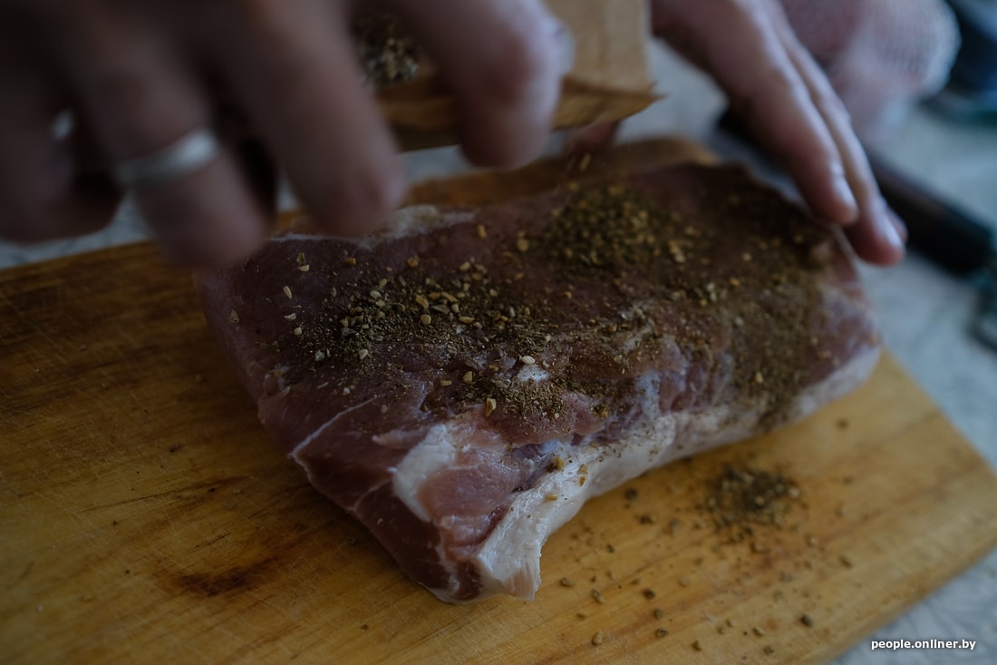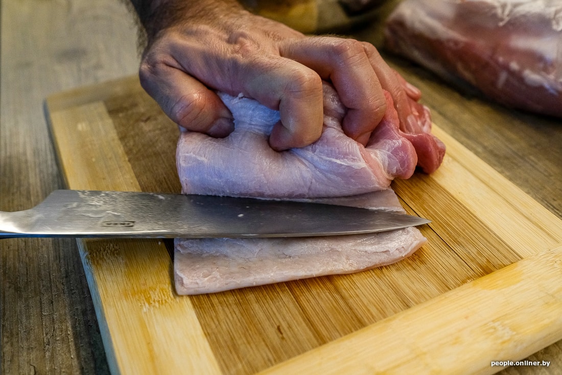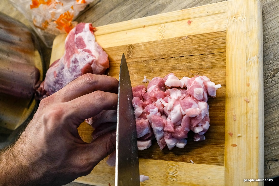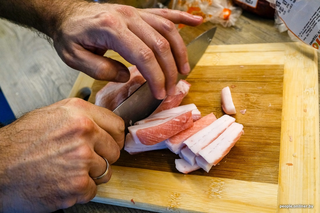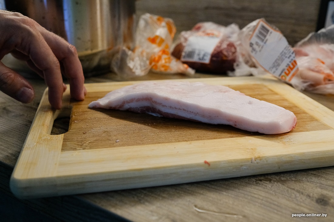 — Снимаем с сала шкуру. Она лишняя, хотя, если ее измельчить и добавить в сардельки, она даст очень хороший вкус. Это же чистый коллаген такой — липкий, соединительный, — рассказывает художник. Ему виднее. Но некрасивые кусочки сала мы тоже отрезаем. Эксперты начинают спорить о том, что такое «сдор» и какое сало вкуснее. Оставим это для следующего эксперимента, уяснив следующее: жир должен быть хребтовым, упругим, твердым.
