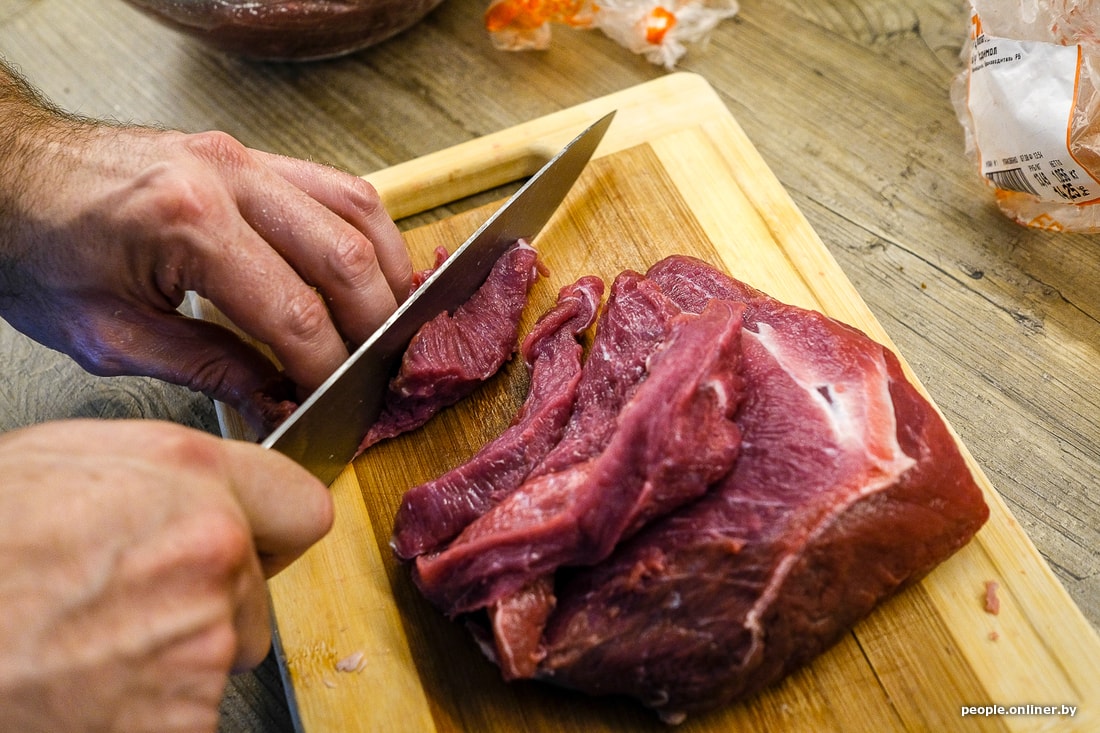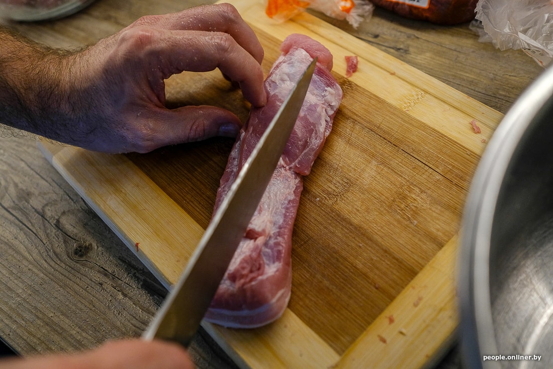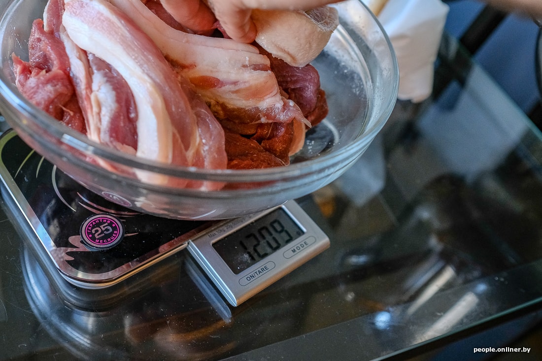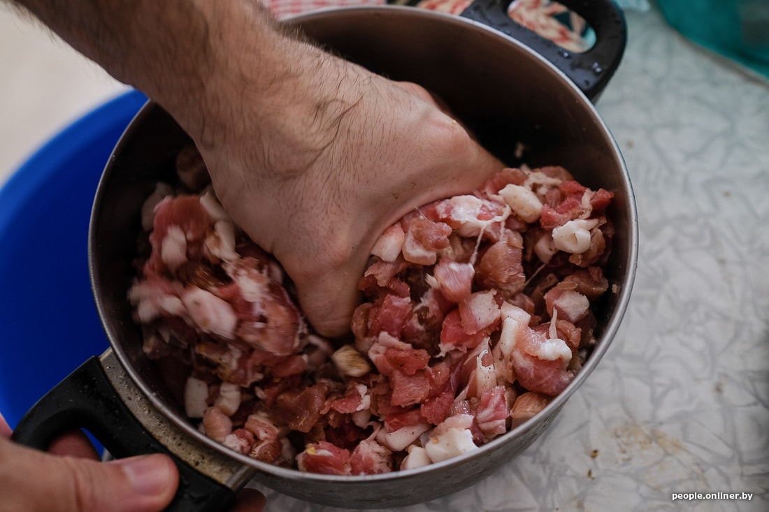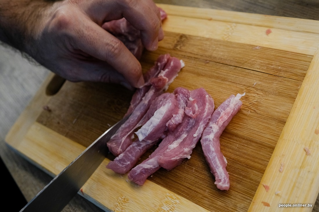 — Снимаем с сала шкуру. Она лишняя, хотя, если ее измельчить и добавить в сардельки, она даст очень хороший вкус. Это же чистый коллаген такой — липкий, соединительный, — рассказывает художник. Ему виднее. Но некрасивые кусочки сала мы тоже отрезаем. Эксперты начинают спорить о том, что такое «сдор» и какое сало вкуснее. Оставим это для следующего эксперимента, уяснив следующее: жир должен быть хребтовым, упругим, твердым.