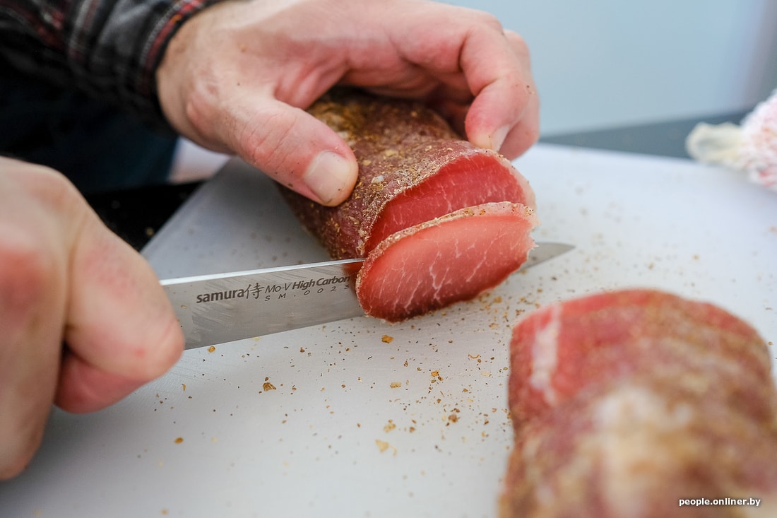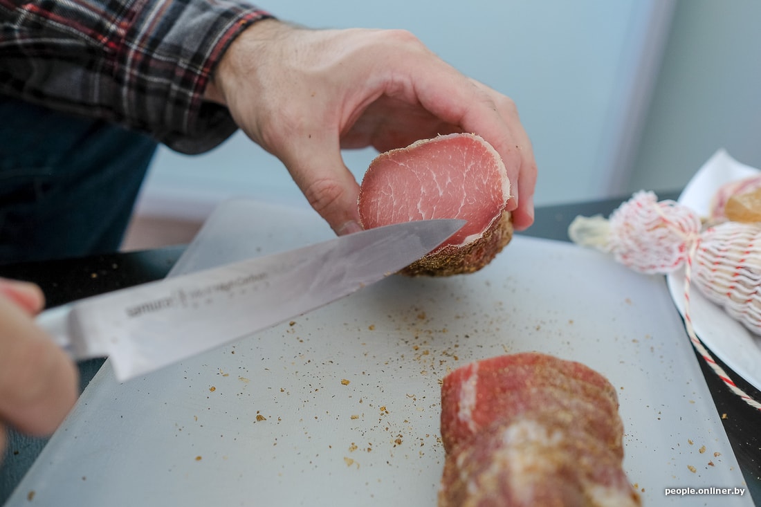 — Айцеловская — супер! — колбасы с Сергеем мы пробовали позавчера. — В ней нет закала, есть кислинка от стартовых культур. Она могла бы зреть еще месяц и становиться еще богаче. Дальше, боюсь, все упирается в качество свинины. Сложно получить богатый вкус от ординарного мяса.