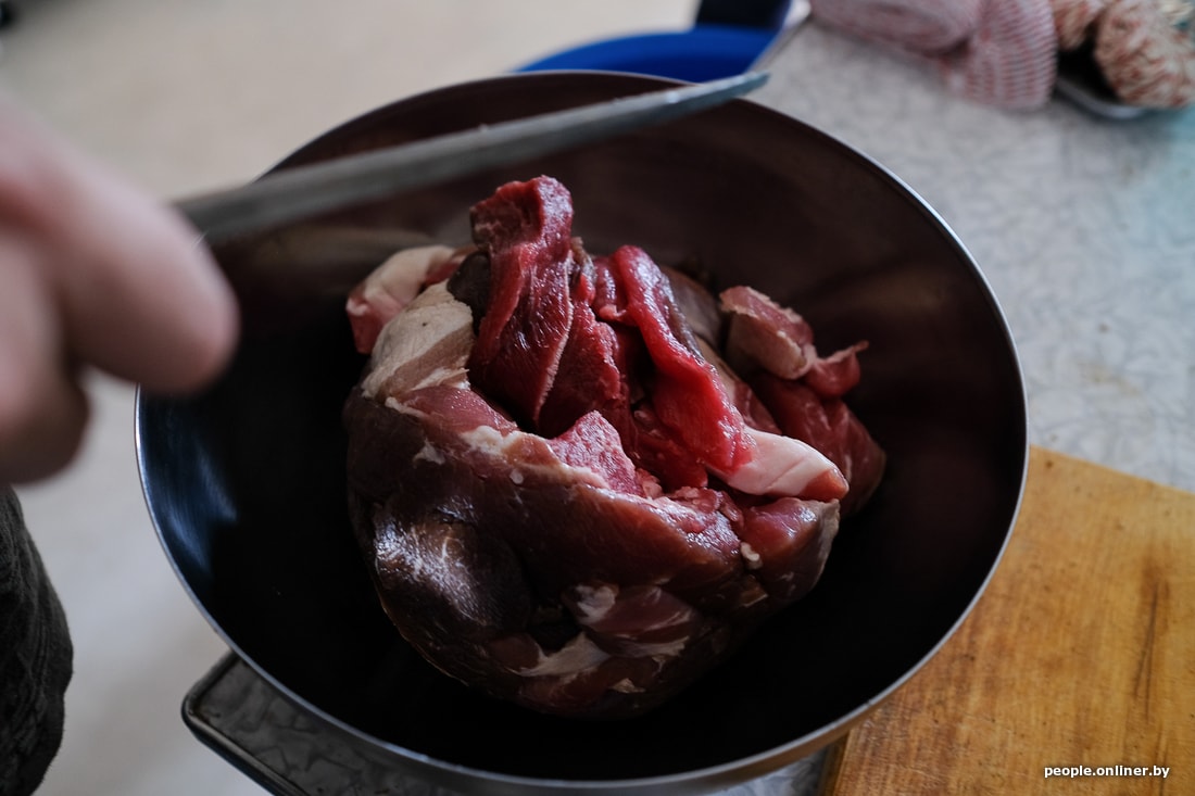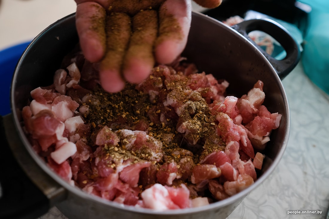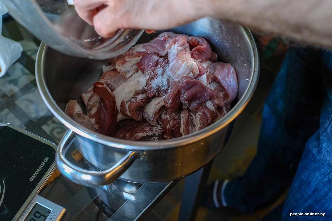 — Нитритную соль добавляем в объеме 2% от количества мяса, — объясняет Сергей.