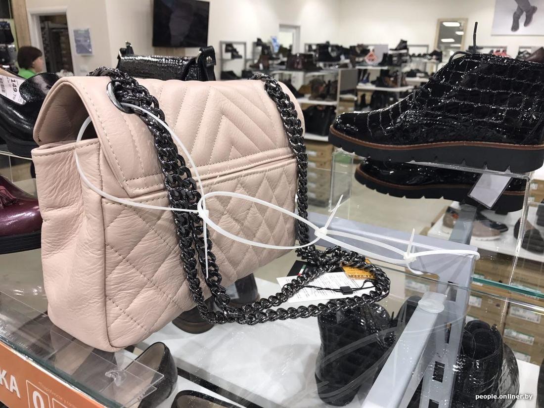 «Магазин „Белвест“ в ТЦ Dana Mall. Черт с ним, что это чисто Chloé. Зачем сумку к полке на поводок привязали-то?!» — написала читательница, приложив фото. На них — дорогие сумки белорусского производства (около 200 рублей за штуку) привязали к полкам звеньями пластиковых хомутов.