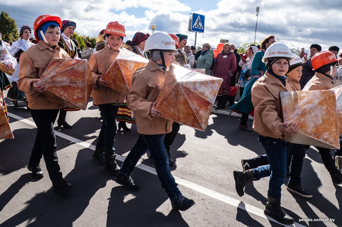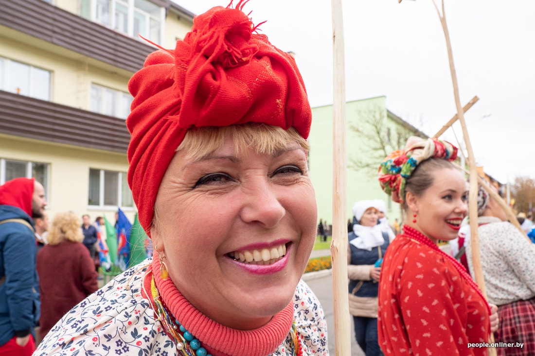 В итоге руководительница не смогла с первого раза пройти в праздничные ворота, на которых было написано «Сардэчна запрашаем». Оказалось, слишком высоко сидит. Но потом качественно пригнулась, сорвав овацию. А ее подопечные следом стройно прокричали что-то про «Любань сее, Любань жне. Любань лепш за ўсiх жыве».
