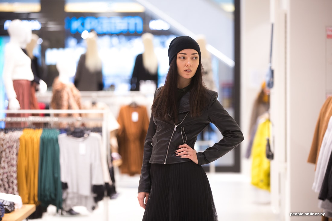 Лера выпархивает из примерочной, облачившись в «готический» наряд: черные кружева, черная кожа, черная шапка.