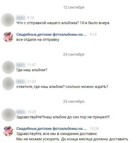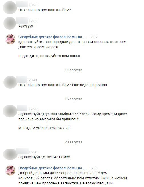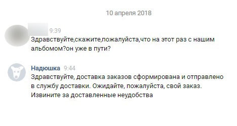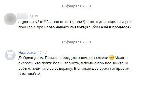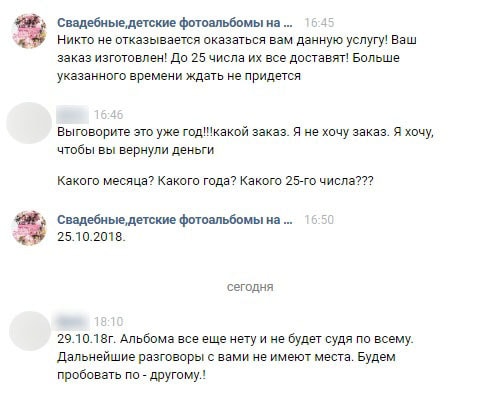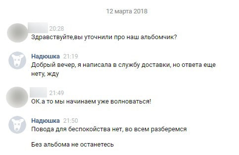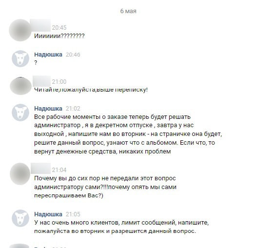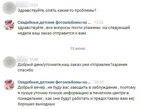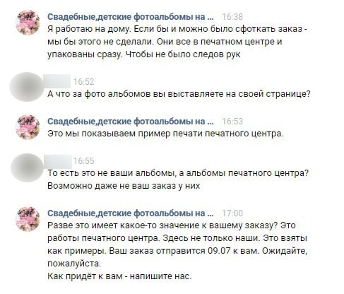 Сначала заказчик общается с «менеджером», потом она оказывается на сносях, передает заказ «администрации» (скорее всего, это она же), удаляет страницу, общение начинается по новой… Также выясняется, что образцы продукции на странице — совсем не их, картинки взяты неизвестно где. Трудно в такое поверить.