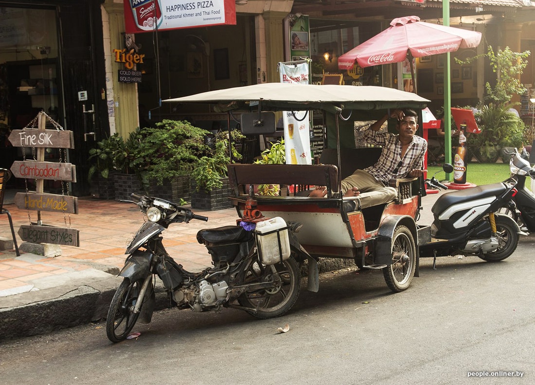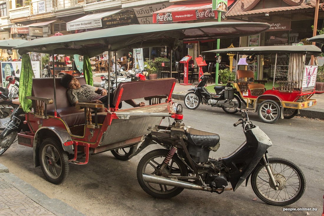 На национальном флаге Камбоджи изображен Ангкор-Ватт, но ребята однозначно погорячились. Я бы бесплатно предложил ребрендинг. Изобрази они тук-тук и нечто сакральное, из недр народной самоидентификации, это зафиксировалось бы официально. Местная идея фикс для мужчины любого возраста, политических взглядов, сексуальных предпочтений — во что бы то ни стало усадить белого в тук-тук. Тук-тук — это такси, чаще всего мотоцикл с прицепом-коляской. У нас сложилось впечатление, что процентов шестьдесят мужского населения промышляют извозом, а все остальные собираются. Вы не пройдете и десяти шагов, не услышав назойливое «тук-тук, мистер». Мамой клянусь, что при виде иностранца даже у полицейских дергаются подбородки брякнуть эту мантру.