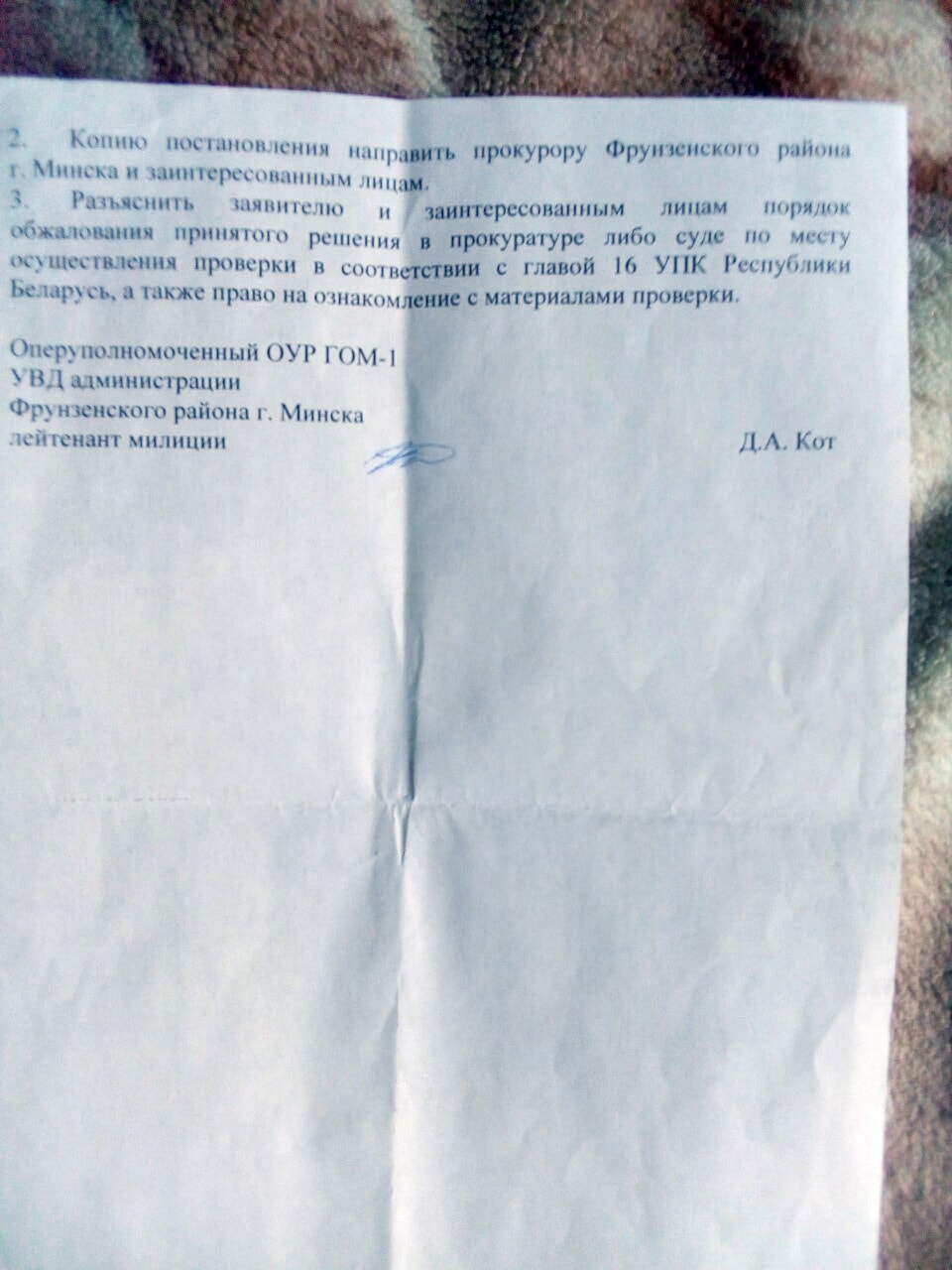 — Но в ходе проверки в возбуждении уголовного дела было отказано в связи с отсутствием в действиях Дмитрия состава преступления, — объясняет Ольга. — В июне мы написали жалобу на РУВД в прокуратуру, и проводилась дополнительная проверка. В возбуждении уголовного дела отказали. В личных беседах говорят, что для возбуждения уголовного дела нужно больше людей. Поэтому мы хотели бы обратиться ко всем, кто сталкивался с Дмитрием, с просьбой не молчать, а также обращаться в правоохранительные органы и связаться с нами.