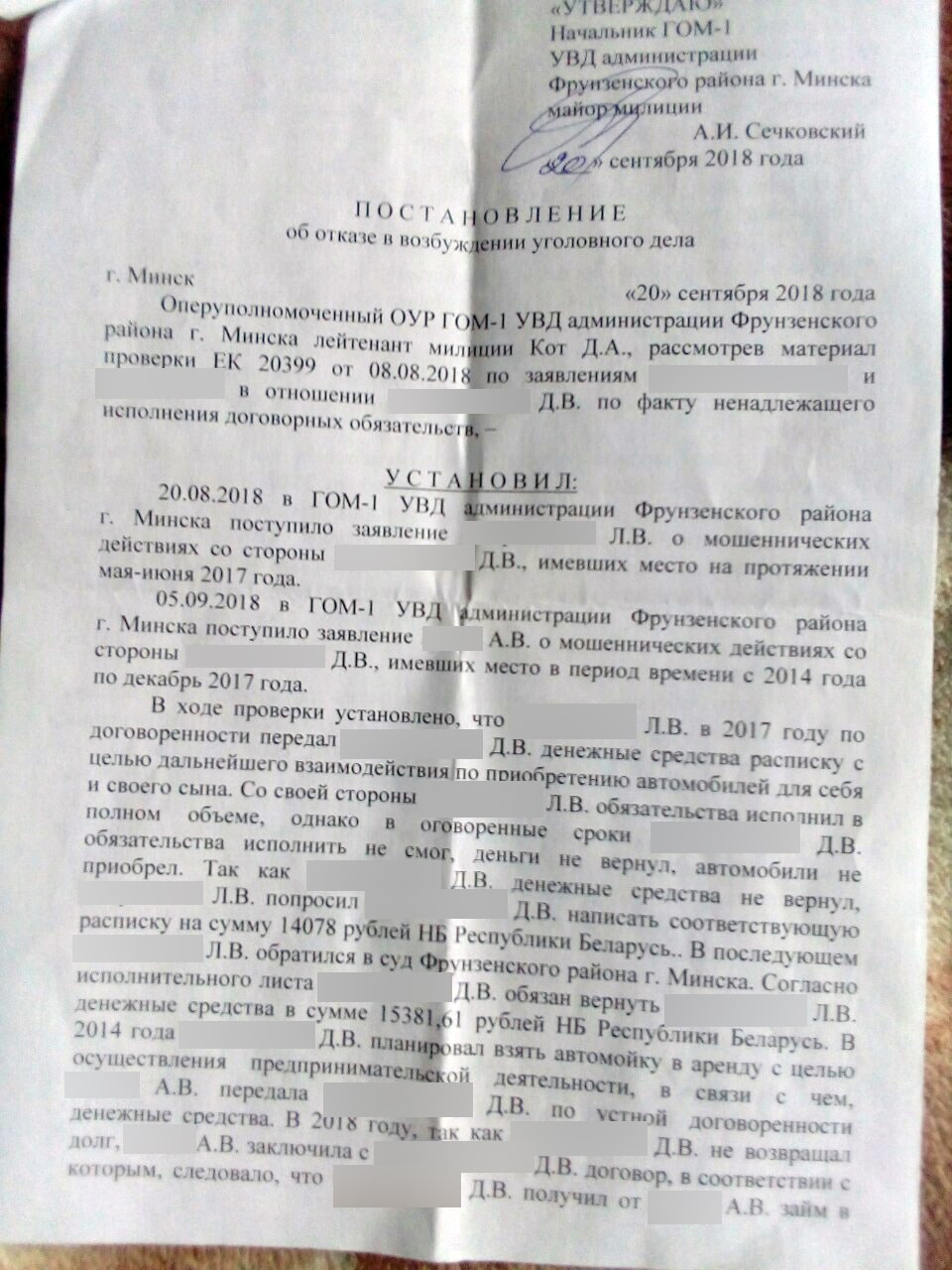 — Я обратился в РУВД с заявлением на Дмитрия, — говорит Леонид. — Он клятвенно пообещал до 10 августа этого года со мной рассчитаться. Вручил мне письменное заявление о том, что вернет деньги, и уговорил забрать заявление из РУВД. Но Дмитрий никаких денег так и не вернул.