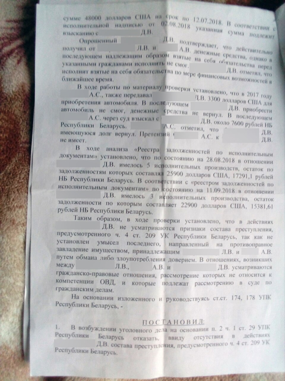 По словам Ольги, он уверял, что вот-вот отдаст деньги. Пара отправилась в суд. В марте их иск о взыскании денежных средств был удовлетворен. Дмитрий вернул чуть больше $4 тыс. — и на этом все... Ольга говорит, что парень до сих пор обещает вернуть деньги, но воз и ныне там. Позже семья узнала, что они были не первыми, кто давал в долг деньги Дмитрию.